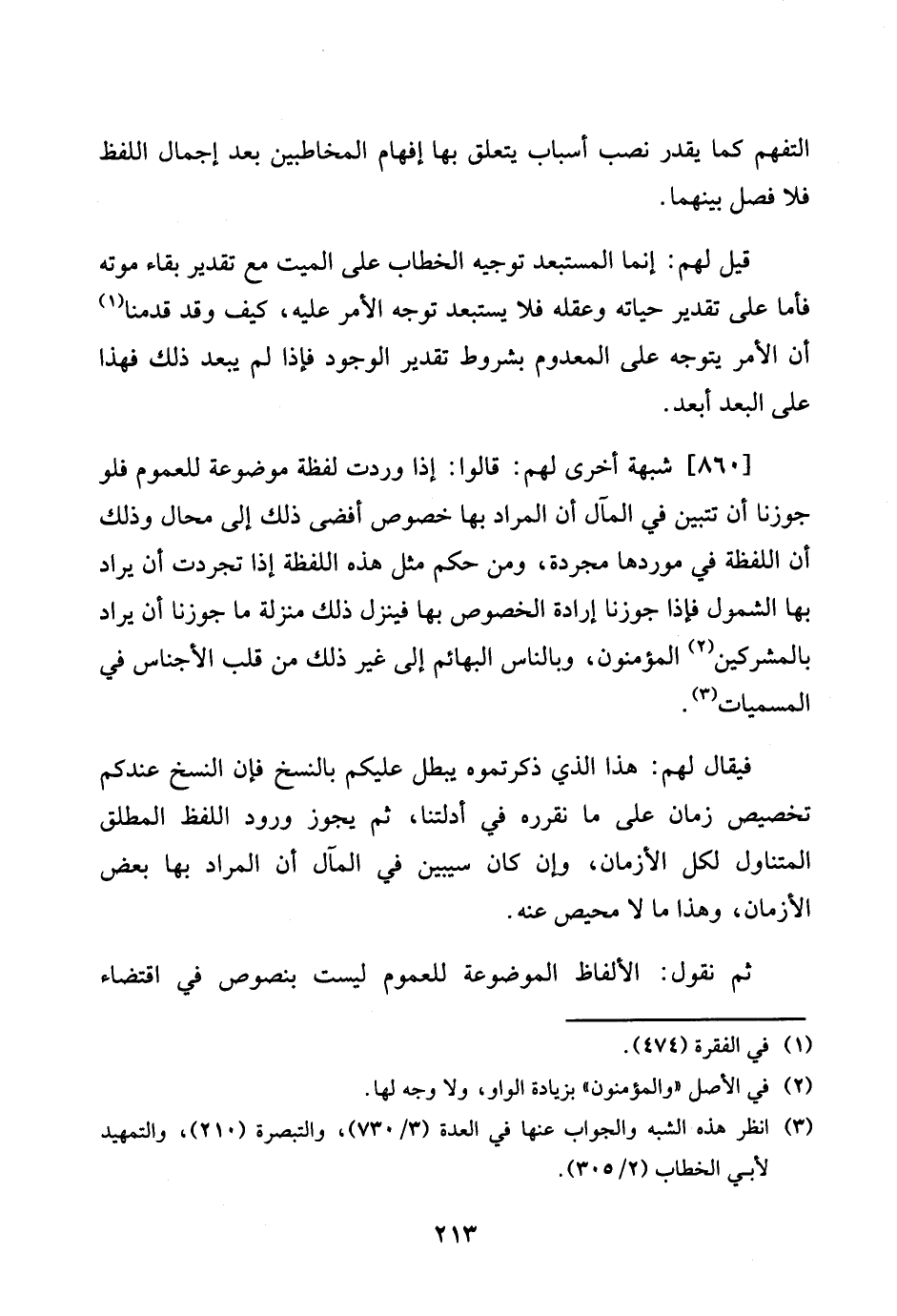 [860] شُبْهَة أُخْرَى لَهُم: قَالُوا: إِذا وَردت لَفْظَة مَوْضُوعَة للْعُمُوم فَلَو جَوَّزنَا أَن تتبين فِي المَال أَن المُرَاد بهَا خُصُوص أفْضى ذَلِك إِلَى محَال وَذَلِكَ أَن اللَّفْظَة فِي موردها مُجَرّدَة، وَمن حكم مثل هَذِه اللَّفْظَة إِذا تجردت أَن يُرَاد بهَا الشُّمُول فَإِذا جَوَّزنَا إِرَادَة الْخُصُوص بهَا فَينزل ذَلِك منزلَة مَا جَوَّزنَا أَن يُرَاد بالمشركين الْمُؤْمِنُونَ، وبالناس الْبَهَائِم إِلَى غير ذَلِك من قلب الْأَجْنَاس فِي المسميات.