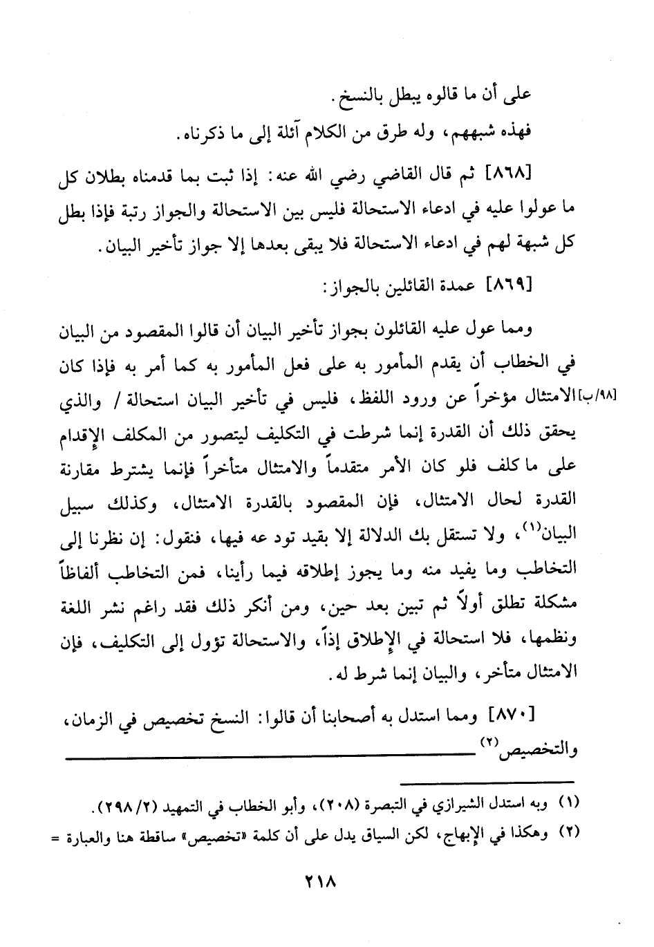 [870] وَمِمَّا اسْتدلَّ بِهِ أَصْحَابنَا أَن قَالُوا: النّسخ تَخْصِيص فِي الزَّمَان، والتخصيص.
