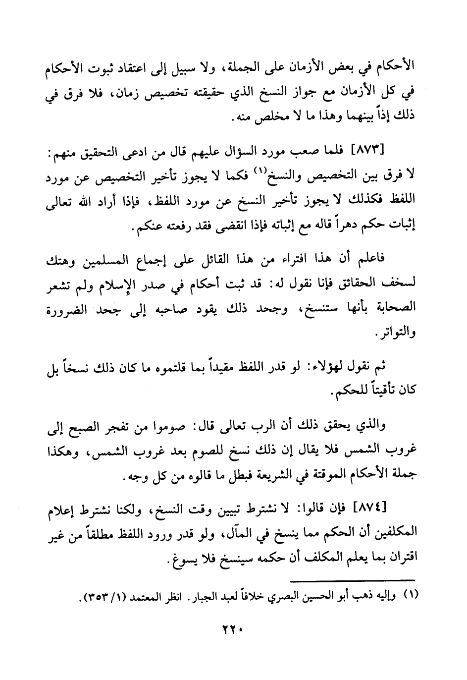 [873] فَلَمَّا صَعب مورد السُّؤَال عَلَيْهِم قَالَ من ادّعى التَّحْقِيق مِنْهُم: لَا فرق بَين التَّخْصِيص والنسخ فَكَمَا لَا يجوز تَأْخِير التَّخْصِيص عَن مورد اللَّفْظ فَكَذَلِك لَا يجوز تَأْخِير النّسخ عَن مورد اللَّفْظ، فَإِذا أَرَادَ الله تَعَالَى إِثْبَات حكم دهرا قَالَه مَعَ إثْبَاته فَإِذا انْقَضى فقد رفعته عَنْكُم.