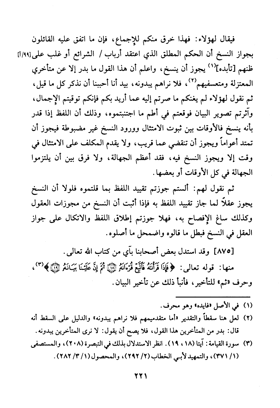 فَيُقَال لهَؤُلَاء: فَهَذَا خرق مِنْكُم للْإِجْمَاع، فَإِن مَا اتّفق عَلَيْهِ الْقَائِلُونَ بِجَوَاز النّسخ أَن الحكم الْمُطلق الَّذِي اعْتقد أَرْبَاب / الشَّرَائِع أَو غلب على [99 / أ] ظنهم [تأبده] يجوز أَن ينْسَخ، وَاعْلَم أَن هَذَا القَوْل مَا بدر إِلَّا عَن متأخري الْمُعْتَزلَة ومتعسفيهم، فَلَا نراهم يبدونه، بيد أَنا أحببنا أَن نذْكر كل مَا قيل، ثمَّ نقُول لهَؤُلَاء لم يغنكم مَا صرتم إِلَيْهِ عَمَّا أُرِيد بكم فَإِنَّكُم توقيتم الْإِجْمَال، وآثرتم تَصْوِير الْبَيَان فوقعتم فِي أعظم مَا اجتنبتموه، وَذَلِكَ أَن اللَّفْظ إِذا قدر بِأَنَّهُ ينْسَخ فالأوقات بَين ثُبُوت الِامْتِثَال وورود النّسخ غير مضبوطة فَيجوز أَن تمتد أعواما وَيجوز أَن تَنْقَضِي عَمَّا قريب وَلَا يقدم الْمُكَلف على الِامْتِثَال فِي وَقت إِلَّا وَيجوز النّسخ فِيهِ، فقد أعظم الْجَهَالَة، وَلَا فرق بَين أَن يلتزموا الْجَهَالَة فِي كل الْأَوْقَات أَو بَعْضهَا. ثمَّ نقُول لَهُم: ألستم جوزتم تَقْيِيد اللَّفْظ بِمَا قلتموه فلولا أَن النّسخ يجوز عقلا لما جَازَ تَقْيِيد اللَّفْظ بِهِ فَإِذا اثْبتْ أَن النّسخ من مجوزات الْعُقُول وَكَذَلِكَ سَاغَ الإفصاح بِهِ، فَهَلا جوزتم إِطْلَاق اللَّفْظ والاتكال على جَوَاز الْعقل فِي النّسخ فَبَطل مَا قَالُوهُ واضمحل مَا أصلوه.