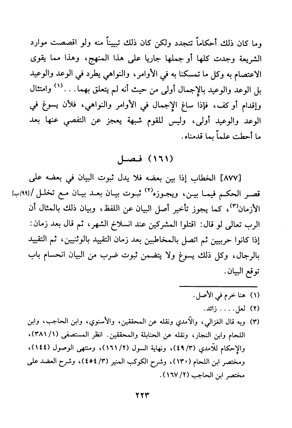 [877] الْخطاب إِذا بَين بعضه فَلَا يدل ثُبُوت الْبَيَان فِي بعضه على قصر الحكم فِيمَا بَين، ويجوزه ثُبُوت بَيَان بعد بَيَان مَعَ تخَلّل / [99 / ب] الْأَزْمَان، كَمَا يجوز تَأْخِير أصل الْبَيَان عَن اللَّفْظ، وَبَيَان ذَلِك بالمثال أَن الرب تَعَالَى لَو قَالَ: اقْتُلُوا الْمُشْركين عِنْد انسلاخ الشَّهْر، ثمَّ قَالَ بعد زمَان: إِذا كَانُوا حربيين ثمَّ اتَّصل بالمخاطبين بعد زمَان التَّقْيِيد بالوثنيين، ثمَّ التَّقْيِيد بِالرِّجَالِ، وكل ذَلِك يسوغ وَلَا يتَضَمَّن ثُبُوت ضرب من الْبَيَان انحسام بَاب توقع الْبَيَان.
