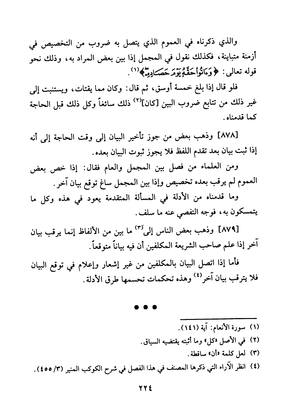 وَالَّذِي ذَكرْنَاهُ فِي الْعُمُوم الَّذِي يتَّصل بِهِ ضروب من التَّخْصِيص فِي أزمنة متباينة، فَكَذَلِك نقُول فِي الْمُجْمل إِذا بَين بعض المُرَاد بِهِ، وَذَلِكَ نَحْو قَوْله تَعَالَى: {وءاتوا حَقه يَوْم حَصَاده} .