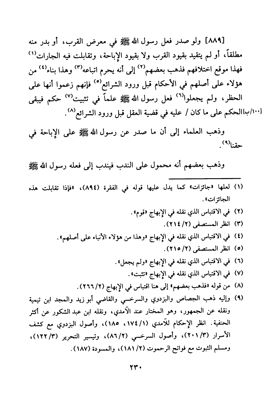 [889] وَلَو صدر فعل رَسُول الله صلى الله عَلَيْهِ وَسلم فِي معرض الْقرب، أَو بدر مِنْهُ مُطلقًا، أَو لم يتَقَيَّد بقيود الْقرب وَلَا بقيود الْإِبَاحَة، وتقابلت فِيهِ الجارات فَهَذَا موقع اخْتلَافهمْ فَذهب بَعضهم إِلَى انه يحرم اتِّبَاعه وَهَذَا بِنَاء من هَؤُلَاءِ على أصلهم فِي الْأَحْكَام قبل وُرُود الشَّرَائِع فَإِنَّهُم زَعَمُوا أَنَّهَا على الْحَظْر، وَلم يجْعَلُوا فعل رَسُول الله صلى الله عَلَيْهِ وَسلم علما فِي تثبيت حكم فَيبقى [100 / ب] الحكم على مَا كَانَ / عَلَيْهِ فِي قَضِيَّة الْعقل قبل وُرُود الشَّرَائِع.