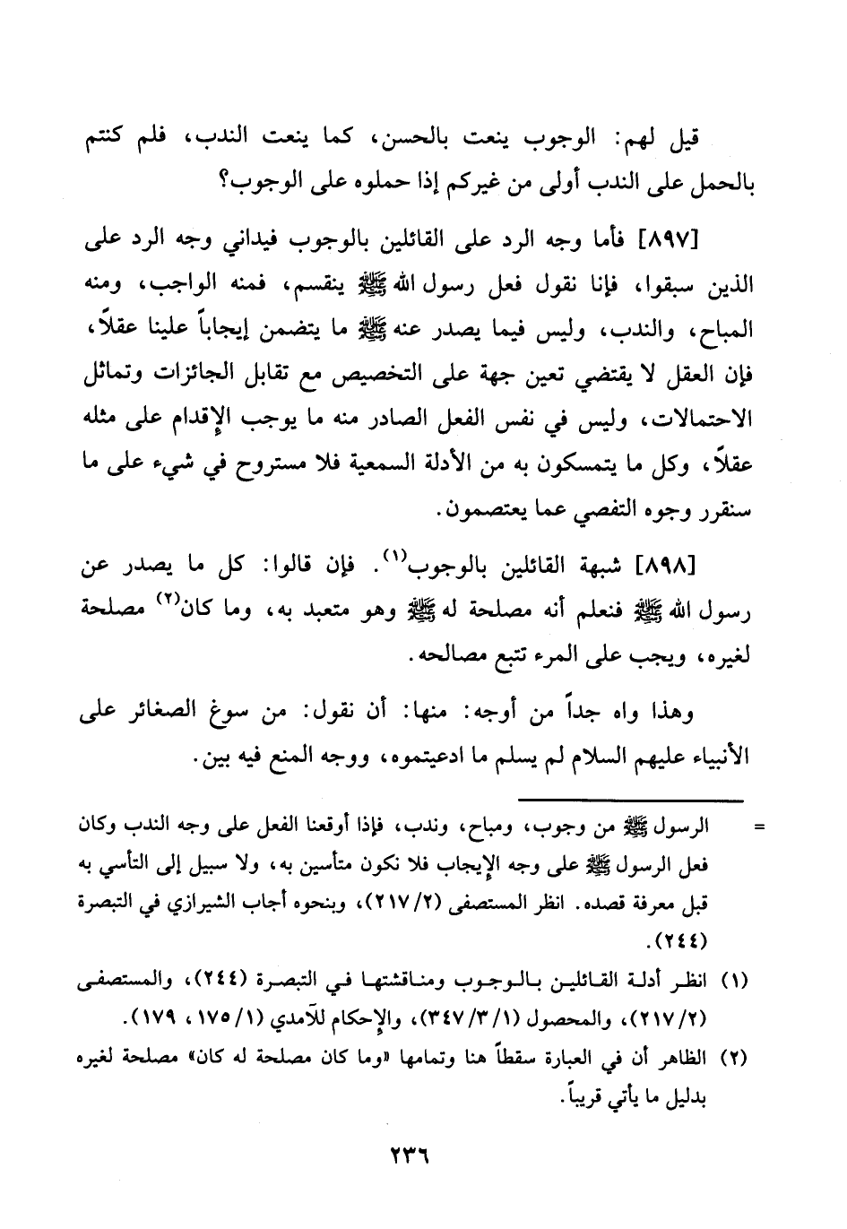 [898] شُبْهَة الْقَائِلين بِالْوُجُوب. فَإِن قَالُوا: كل مَا يصدر عَن رَسُول الله صلى الله عَلَيْهِ وَسلم فنعلم أَنه مصلحَة لَهُ صلى الله عَلَيْهِ وَسلم وَهُوَ متعبد بِهِ، وَمَا كَانَ مصلحَة لغيره، وَيجب على الْمَرْء تتبع مَصَالِحه.