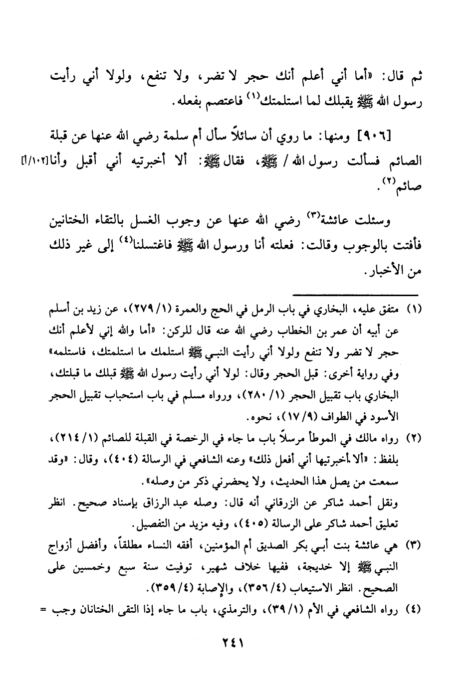 وسئلت عَائِشَة رَضِي الله عَنْهَا عَن وجوب الْغسْل بالتقاء الختانين فأفتت بِالْوُجُوب وَقَالَت: فعلته أَنا وَرَسُول الله صلى الله عَلَيْهِ وَسلم فاغتسلنا إِلَى غير ذَلِك من الْأَخْبَار.