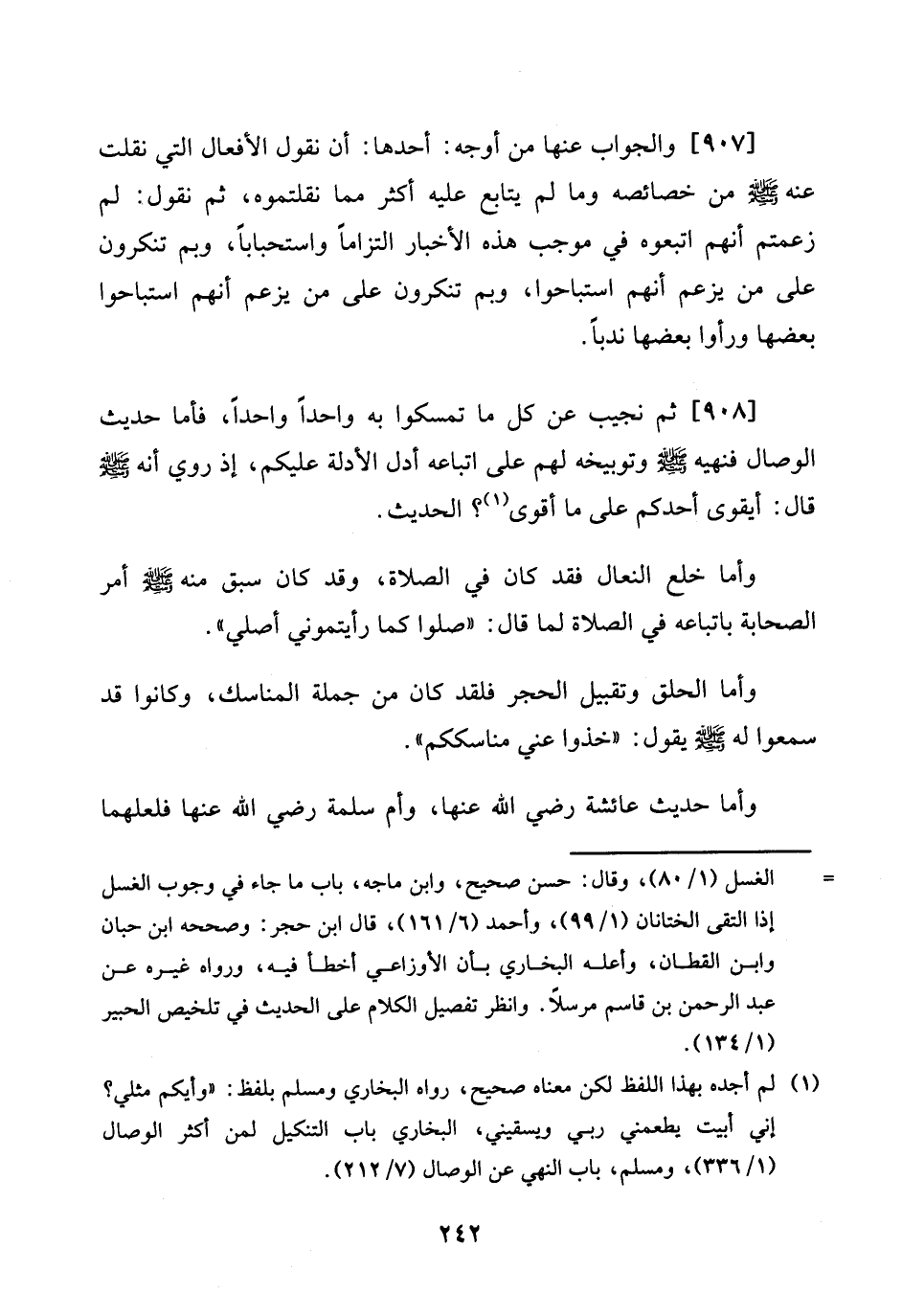 [907] وَالْجَوَاب عَنْهَا من أوجه: أَحدهَا: أَن نقُول الْأَفْعَال الَّتِي نقلت عَنهُ صلى الله عَلَيْهِ وَسلم من خَصَائِصه وَمَا لم يُتَابع عَلَيْهِ أَكثر مِمَّا نقلتموه، ثمَّ نقُول: لم زعمتم أَنهم اتَّبعُوهُ فِي مُوجب هَذِه الْأَخْبَار التزاما واستحبابا، وَبِمَ تنكرون على من يزْعم أَنهم استباحوا، وَبِمَ تنكرون على من يزْعم انهم استباحوا بَعْضهَا وَرَأَوا بَعْضهَا ندبا.