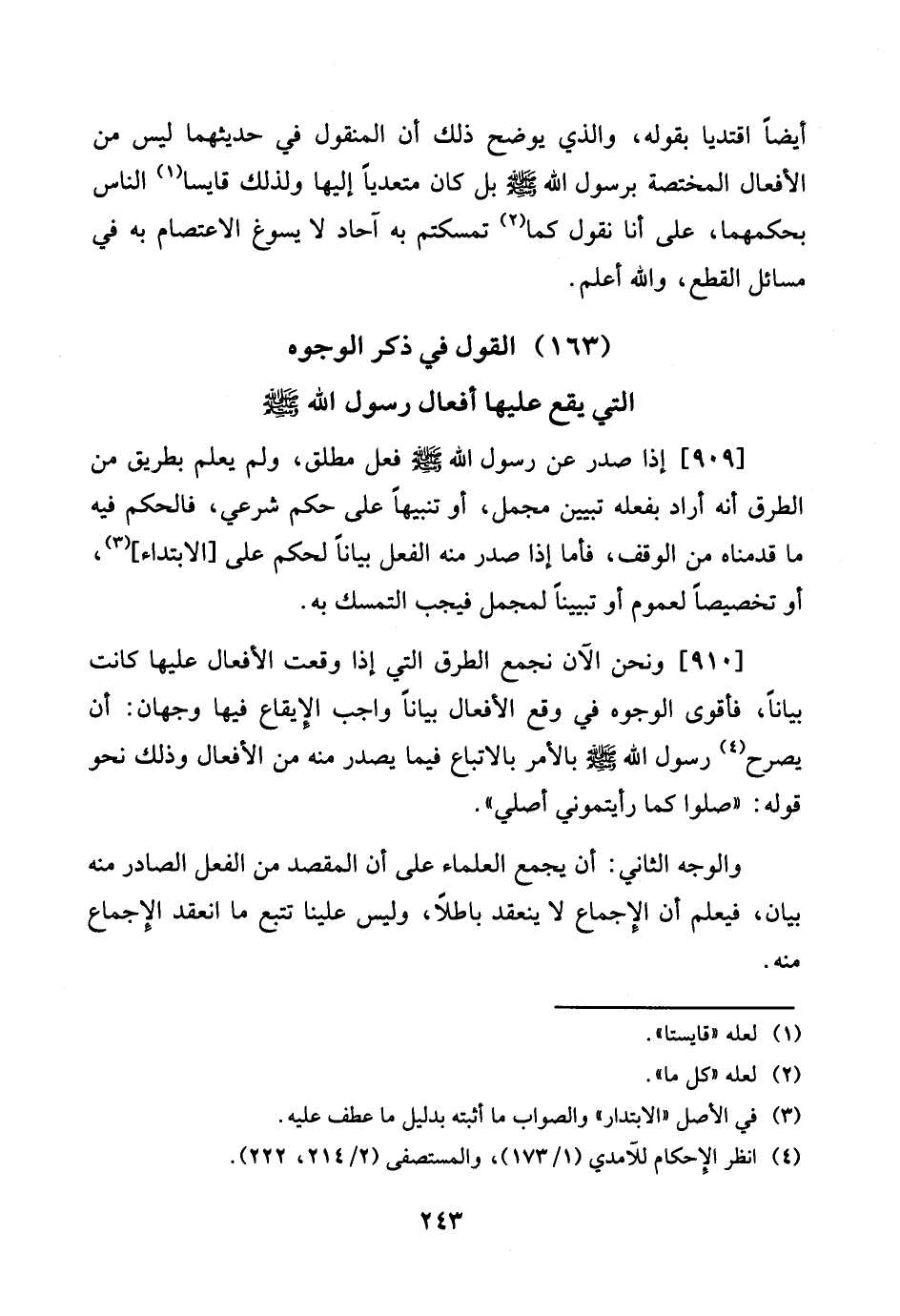 [910] وَنحن الْآن نجمع الطّرق الَّتِي إِذا وَقعت الْأَفْعَال عَلَيْهَا كَانَت بَيَانا، فأقوى الْوُجُوه فِي وَقع الْأَفْعَال بَيَانا وَاجِب الْإِيقَاع فِيهَا وَجْهَان: أَن يُصَرح رَسُول الله صلى الله عَلَيْهِ وَسلم بِالْأَمر بالاتباع فِيمَا يصدر مِنْهُ من الْأَفْعَال وَذَلِكَ نَحْو قَوْله: " صلوا كَمَا أيتموني اصلي ".