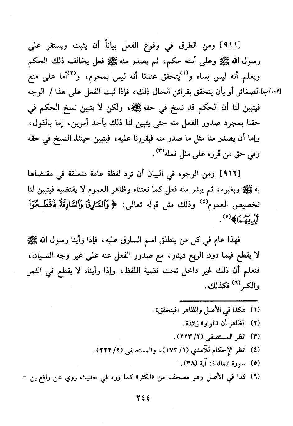[912] وَمن الْوُجُوه فِي الْبَيَان أَن ترد لَفْظَة عَامَّة مُتَعَلقَة فِي مقتضاها بِهِ صلى الله عَلَيْهِ وَسلم وَبِغَيْرِهِ، ثمَّ يبدر مِنْهُ فعل كَمَا نعتناه وَظَاهر الْعُمُوم لَا يَقْتَضِيهِ فيتبين لنا تَخْصِيص الْعُمُوم وَذَلِكَ مثل قَوْله تَعَالَى: {وَالسَّارِق والسارقة فَاقْطَعُوا أَيْدِيهِمَا} .