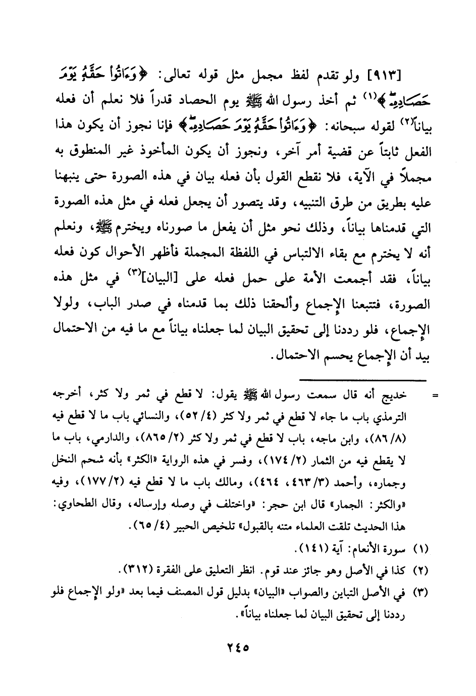 [913] وَلَو تقدم لفظ مُجمل مثل قَوْله تَعَالَى: {وَآتوا حَقه يَوْم حَصَاده} ثمَّ أَخذ رَسُول الله صلى الله عَلَيْهِ وَسلم يَوْم الْحَصاد قدرا فَلَا نعلم أَن فعله بَيَانا لقَوْله سُبْحَانَهُ: {وَآتوا حَقه يَوْم حَصَاده} فَإنَّا نجوز أَن يكون هَذَا الْفِعْل ثَابتا عَن قَضِيَّة أَمر آخر، ونجوز أَن يكون الْمَأْخُوذ غير الْمَنْطُوق بِهِ مُجملا فِي الْآيَة، فَلَا نقطع القَوْل بِأَن فعله بَيَان فِي هَذِه الصُّورَة حَتَّى ينبهنا عَلَيْهِ بطرِيق من طرق التَّنْبِيه، وَقد يتَصَوَّر أَن يَجْعَل فعله فِي مثل هَذِه الصُّورَة الَّتِي قدمناها بَيَانا، وَذَلِكَ نَحْو مثل أَن يفعل مَا صورناه ويخترم صلى الله عَلَيْهِ وَسلم، ونعلم أَنه لَا يخترم مَعَ بَقَاء الالتباس فِي اللَّفْظَة المجملة فأظهر الْأَحْوَال كَون فعله بَيَانا، فقد أَجمعت الْأمة على حمل فعله على [الْبَيَان] فِي مثل هَذِه الصُّورَة، فتتبعنا الْإِجْمَاع وألحقنا ذَلِك بِمَا قدمْنَاهُ فِي صدر الْبَاب، وَلَوْلَا الْإِجْمَاع، فَلَو رددنا إِلَى تَحْقِيق الْبَيَان لما جَعَلْنَاهُ بَيَانا مَعَ مَا فِيهِ من الِاحْتِمَال بيد أَن الْإِجْمَاع يحسم الِاحْتِمَال.
