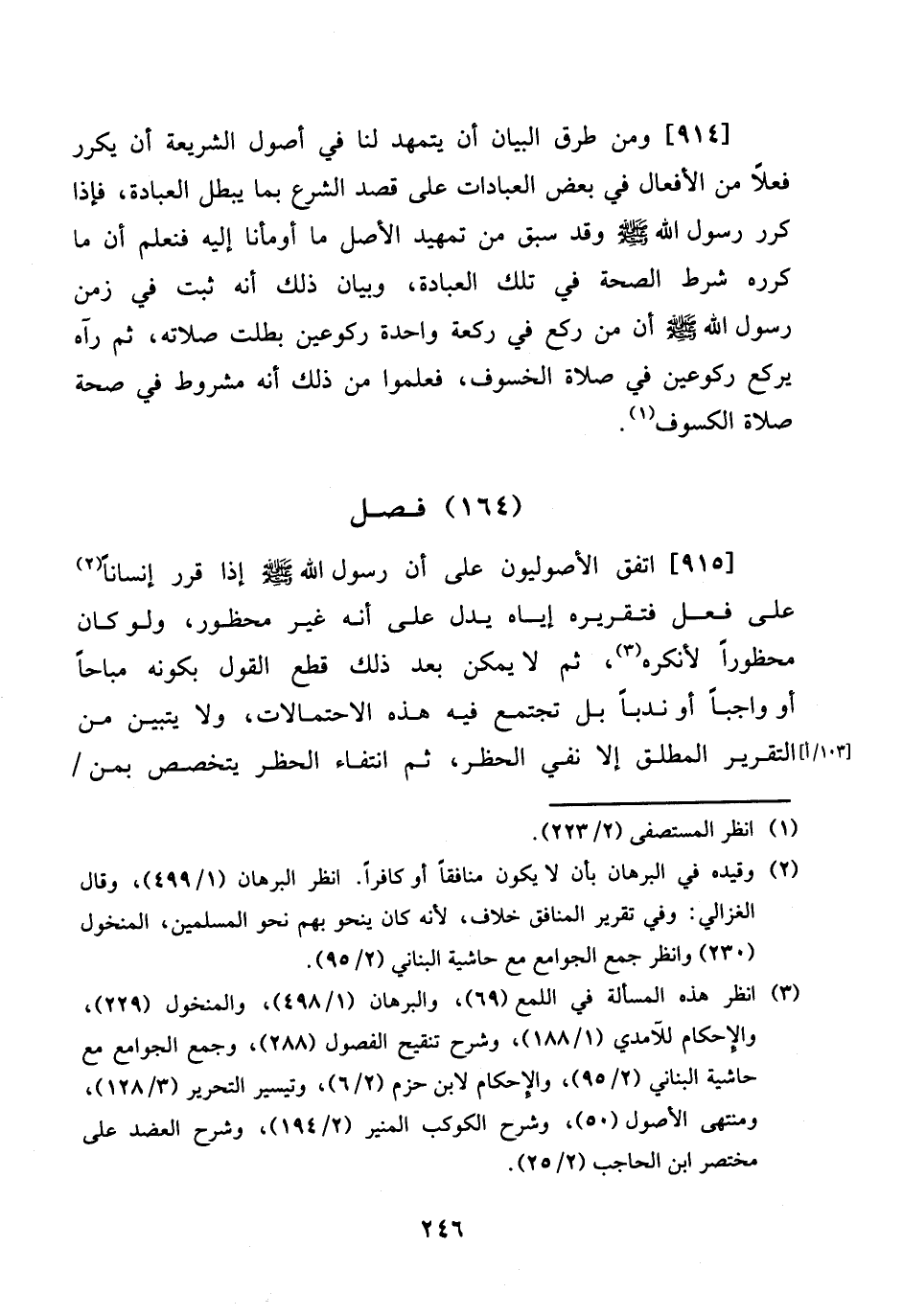 [914] وَمن طرق الْبَيَان أَن بتمهد لنا فِي أصُول الشَّرِيعَة أَن يُكَرر فعلا من الْأَفْعَال فِي بعض الْعِبَادَات على قصد الشَّرْع بِمَا يبطل الْعِبَادَة، فَإِذا كرر رَسُول الله صلى الله عَلَيْهِ وَسلم وَقد سبق من تمهيد الأَصْل مَا أومأنا إِلَيْهِ فنعلم أَن مَا كَرَّرَه شَرط الصِّحَّة فِي تِلْكَ الْعِبَادَة، وَبَيَان ذَلِك أَنه ثَبت فِي زمن رَسُول الله صلى الله عَلَيْهِ وَسلم أَن من ركع فِي رَكْعَة وَاحِدَة ركوعين بطلت صلَاته، ثمَّ رَآهُ يرْكَع ركوعين فِي صَلَاة الخسوف، فَعَلمُوا من ذَلِك أَنه مَشْرُوط فِي صِحَة صَلَاة الْكُسُوف.