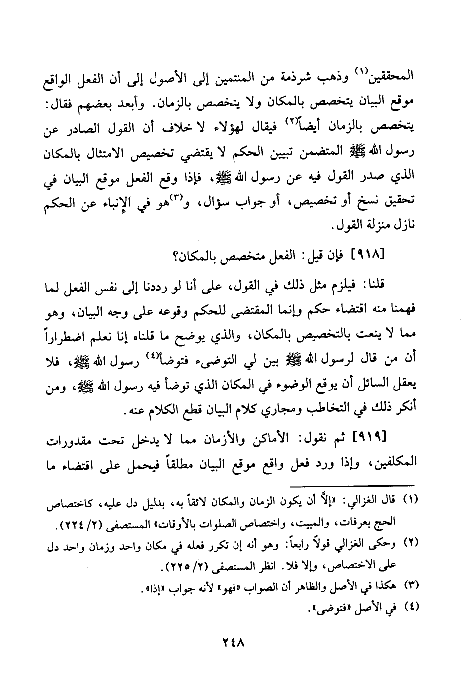 الْمُحَقِّقين وَذهب شرذمة من المنتمين إِلَى الْأُصُول إِلَى أَن الْفِعْل الْوَاقِع موقع الْبَيَان يتخصص بِالْمَكَانِ وَلَا يتخصص بِالزَّمَانِ. وَأبْعد بَعضهم فَقَالَ: يتخصص بِالزَّمَانِ ايضا فَيُقَال لهَؤُلَاء لَا خلاف أَن القَوْل الصَّادِر عَن رَسُول الله صلى الله عَلَيْهِ وَسلم المتضمن تَبْيِين الحكم لَا يَقْتَضِي تَخْصِيص الِامْتِثَال بِالْمَكَانِ الَّذِي صدر القَوْل فِيهِ عَن رَسُول الله صلى الله عَلَيْهِ وَسلم، فَإِذا وَقع الْفِعْل موقع الْبَيَان فِي تَحْقِيق نسخ أَو تَخْصِيص، اَوْ جَوَاب سُؤال، وَهُوَ فِي الإنباء عَن الحكم نَازل منزلَة القَوْل.