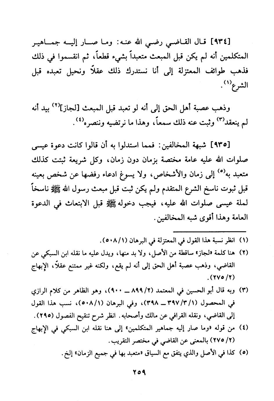 [935] شُبْهَة الْمُخَالفين: فمما استدلوا بِهِ أَن قَالُوا كَانَت دَعْوَة عِيسَى صلوَات الله عَلَيْهِ عَامَّة مُخْتَصَّة بِزَمَان دون زمَان، وكل شَرِيعَة ثبتَتْ كَذَلِك متعبد بِهِ إِلَى زمَان والأشخاص،، وَلَا يسوغ ادِّعَاء رفضها عَن شخص بِعَيْنِه قبل ثُبُوت نَاسخ الشَّرْع الْمُتَقَدّم وَلم يكن ثَبت قبل مبعث رَسُول الله صلى الله عَلَيْهِ وَسلم نَاسِخا لملة عِيسَى صلوَات الله عَلَيْهِ، فَيجب دُخُوله صلى الله عَلَيْهِ وَسلم قبل الابتعاث فِي الدعْوَة الْعَامَّة وَهَذَا أقوى شبه الْمُخَالفين