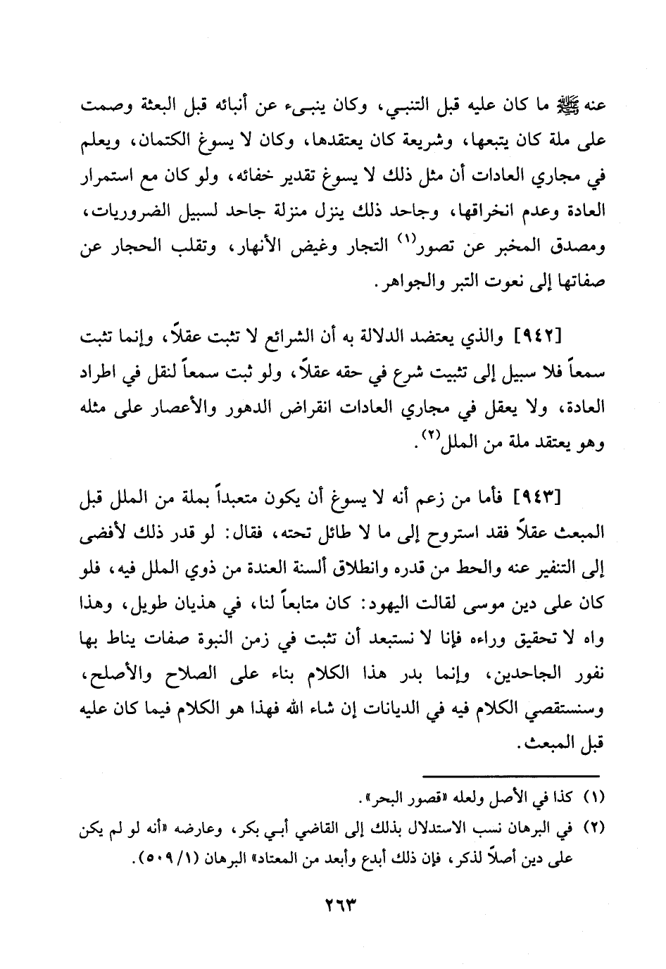 [942] وَالَّذِي يعتضد الدّلَالَة بِهِ أَن الشَّرَائِع لَا تثبت عقلا، وَإِنَّمَا تثبت سمعا فَلَا سَبِيل إِلَى تثبيت شرع فِي حَقه عقلا، وَلَو ثَبت سمعا لنقل فِي اطراد الْعَادة، وَلَا يعقل فِي مجاري الْعَادَات انْقِرَاض الدهور والأعصار على مثله وَهُوَ يعْتَقد مِلَّة من الْملَل.