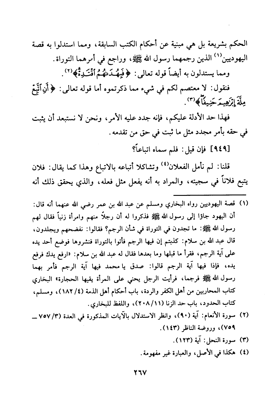 الحكم بشريعة بل هِيَ مَبْنِيَّة عَن أَحْكَام الْكتب السَّابِقَة، وَمِمَّا استدلوا بِهِ قصَّة الْيَهُودِيين الَّذين رجمهما رَسُول الله صلى الله عَلَيْهِ وَسلم، وراجع فِي أَمرهمَا التَّوْرَاة.