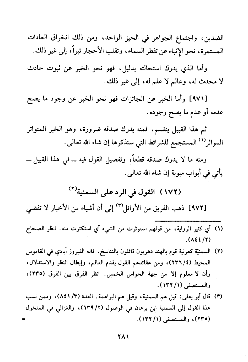 [972] ذهب الْفَرِيق من الْأَوَائِل إِلَى أَن اشياء من الْأَخْبَار لَا تُفْضِي
