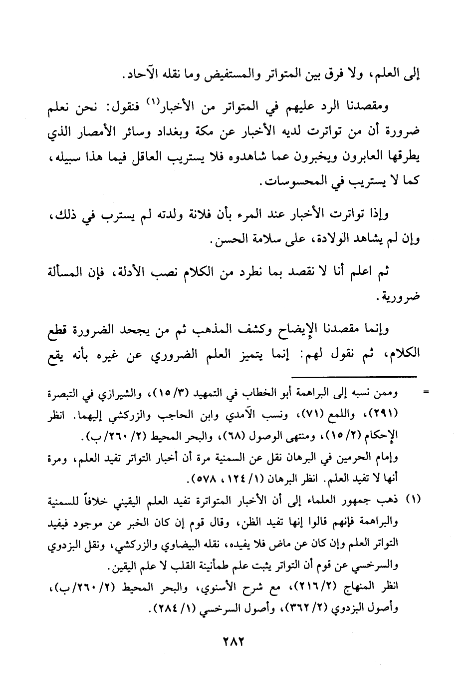 ومقصدنا الرَّد عَلَيْهِم فِي الْمُتَوَاتر من الْأَخْبَار فَنَقُول: نَحن نعلم ضَرُورَة أَن من تَوَاتَرَتْ لَدَيْهِ الْأَخْبَار عَن مَكَّة وبغداد وَسَائِر الْأَمْصَار الَّذِي يطرقها العابرون ويخبرون عَمَّا شاهدوه فَلَا يستريب الْعَاقِل فِيمَا هَذَا سَبيله، كَمَا لَا يستريب فِي المحسوسات.
