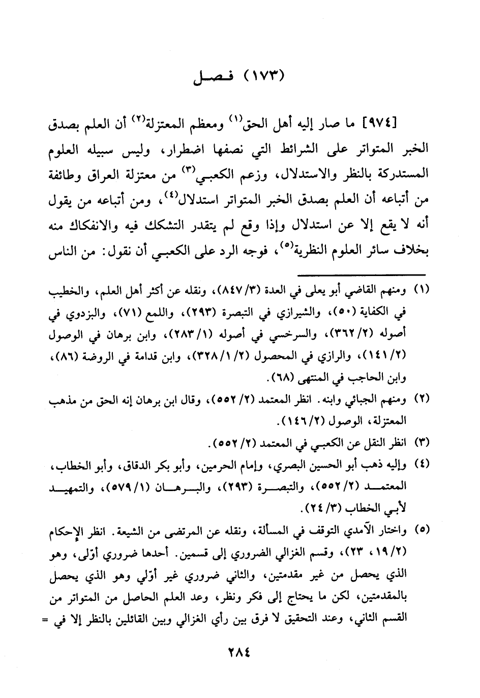 [974] مَا صَار إِلَيْهِ أهل الْحق ومعظم الْمُعْتَزلَة إِن الْعلم بِصدق الْخَبَر الْمُتَوَاتر على الشَّرَائِط الَّتِي نصفهَا اضطرار، وَلَيْسَ سَبيله الْعُلُوم المستدركة بِالنّظرِ وَالِاسْتِدْلَال، وَزعم الكعبي من معتزلة الْعرَاق وَطَائِفَة من أَتْبَاعه أَن الْعلم بِصدق الْخَبَر الْمُتَوَاتر اسْتِدْلَال، وَمن أَتْبَاعه من يَقُول أَنه لَا يَقع إِلَّا عَن اسْتِدْلَال وَإِذا وَقع لم يتَقَدَّر التشكك فِيهِ والانفكاك مِنْهُ بِخِلَاف سَائِر الْعُلُوم النظرية، فَوجه الرَّد على الكعبي أَن نقُول: من النَّاس