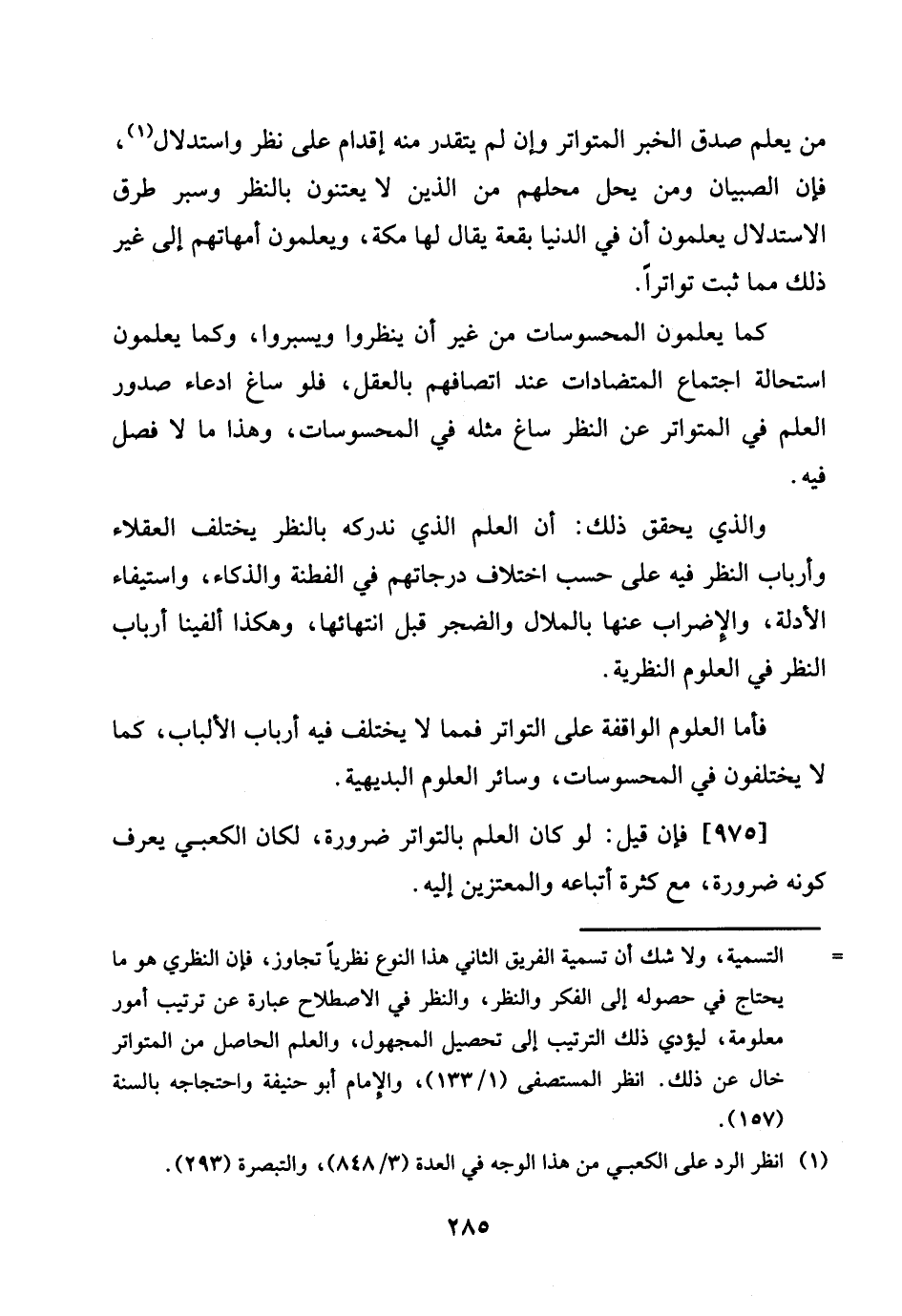 فَأَما الْعُلُوم الواقفة على التَّوَاتُر فمما لَا يخْتَلف فِيهِ أَرْبَاب الْأَلْبَاب، كَمَا لَا يَخْتَلِفُونَ فِي المحسوسات، وَسَائِر الْعُلُوم البديهية.