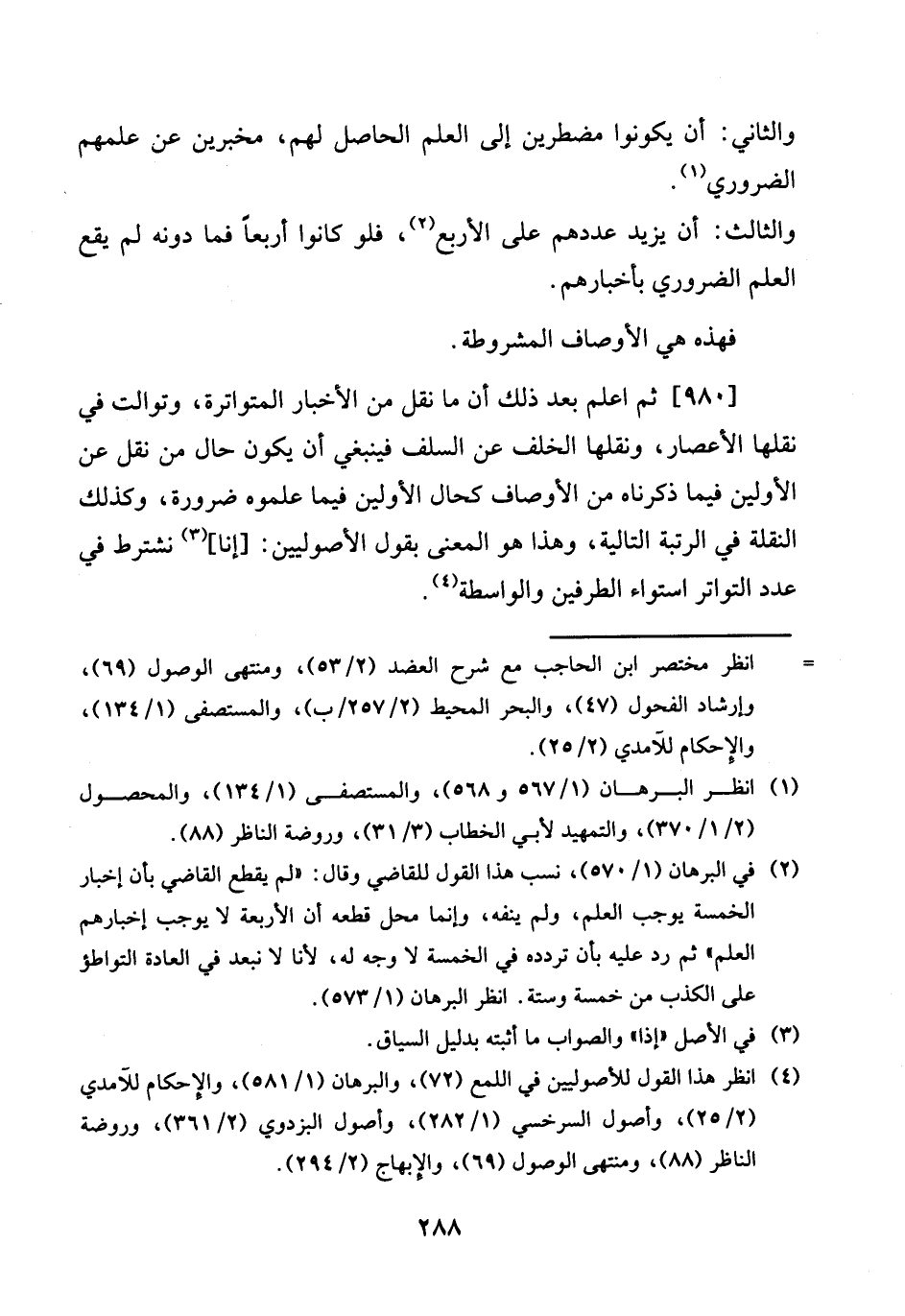 [980] ثمَّ اعْلَم بعد ذَلِك أَن مَا نقل من الْأَخْبَار المتواترة، وتوالت فِي نقلهَا الْأَعْصَار، ونقلها الْخلف عَن السّلف فَيَنْبَغِي أَن يكون حَال من نقل عَن الْأَوَّلين فِيمَا ذَكرْنَاهُ من الْأَوْصَاف كَحال الْأَوَّلين فِيمَا علموه ضَرُورَة، وَكَذَلِكَ النقلَة فِي الرُّتْبَة التالية، وَهَذَا هُوَ الْمَعْنى بقول الْأُصُولِيِّينَ: [إِنَّا] نشترط فِي عدد التَّوَاتُر اسْتِوَاء الطَّرفَيْنِ والواسطة.