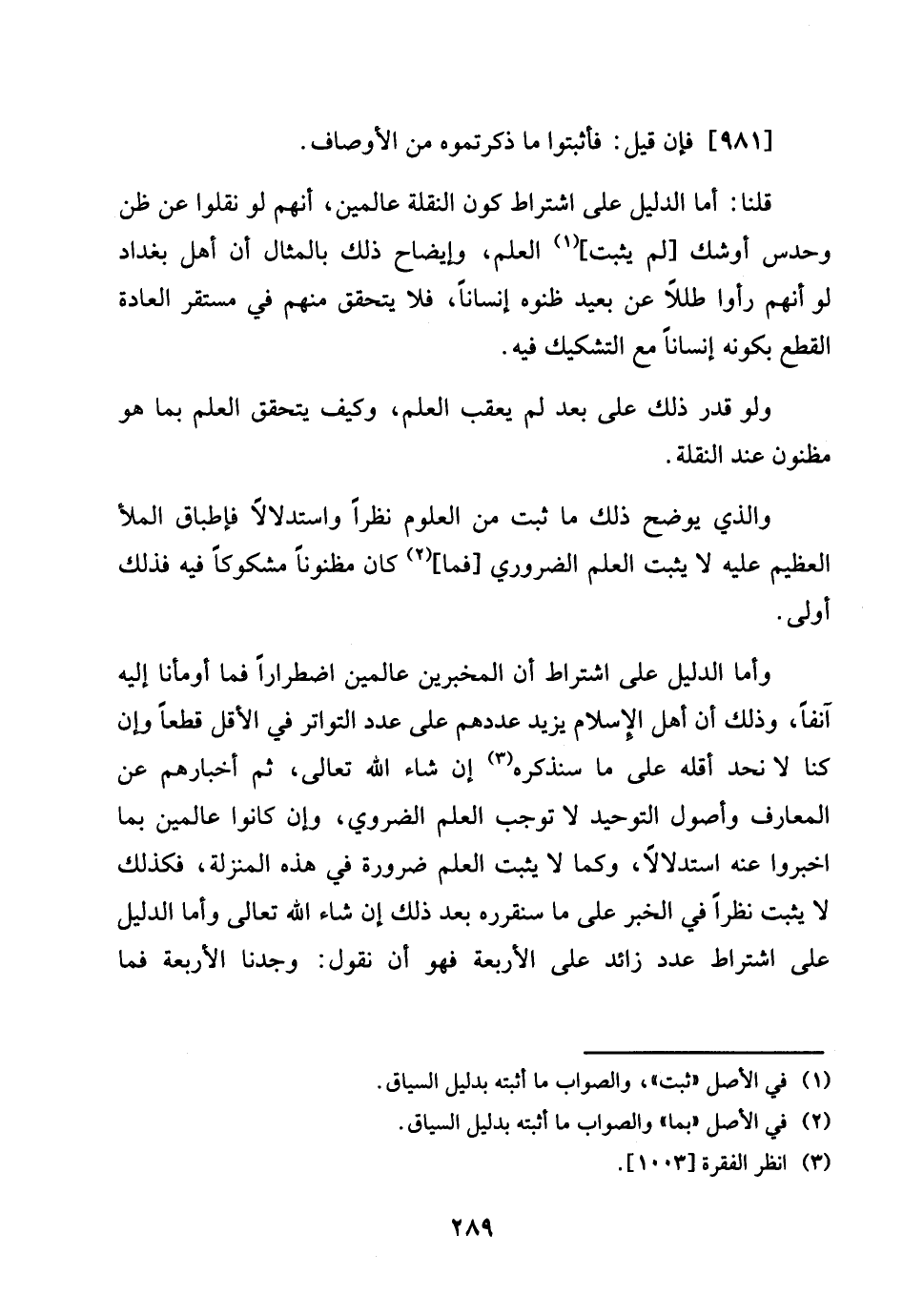 وَأما الدَّلِيل على اشْتِرَاط أَن المخبرين عَالمين اضطرارا فَمَا أومأنا إِلَيْهِ آنِفا، وَذَلِكَ أَن أهل الْإِسْلَام يزِيد عَددهمْ على عدد التَّوَاتُر فِي الْأَقَل قطعا وَإِن كُنَّا لَا نحد أَقَله على مَا سَنذكرُهُ إِن شَاءَ الله تَعَالَى، ثمَّ أخبارهم عَن المعارف واصول التَّوْحِيد لَا توجب الْعلم الضَّرُورِيّ، وَإِن كَانُوا عَالمين بِمَا اخبروا عَنهُ اسْتِدْلَالا، وكما لَا يثبت الْعلم ضَرُورَة فِي هَذِه الْمنزلَة، فَكَذَلِك لَا يثبت نظرا فِي الْخَبَر على مَا سنقرره بعد ذَلِك إِن شَاءَ الله لَهُ تَعَالَى وَأما الدَّلِيل على اشْتِرَاط عدد زَائِد على الْأَرْبَعَة فَهُوَ أَن نقُول: وجدنَا الْأَرْبَعَة فَمَا