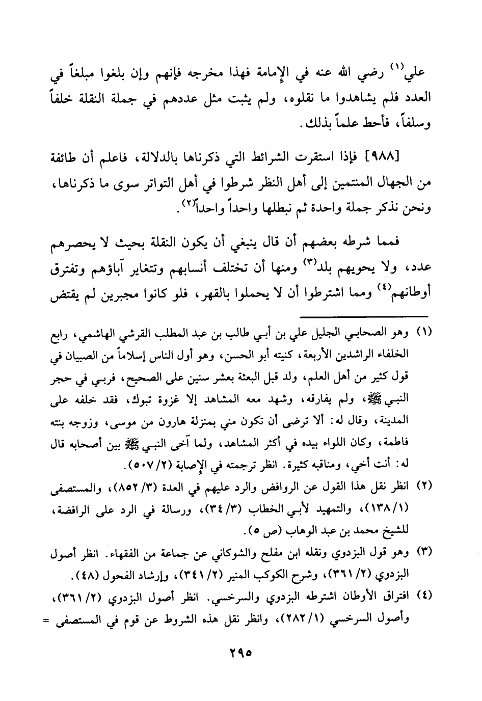 عَليّ رَضِي الله عَنهُ فِي الْإِمَامَة فَهَذَا مخرجه فَإِنَّهُم وَإِن بلغُوا مبلغا فِي الْعدَد فَلم يشاهدوا مَا نقلوه، وَلم يثبت مثل عَددهمْ فِي جملَة النقلَة خلفا وسلفا، فأحط علما بذلك. [988] فَإِذا اسْتَقَرَّتْ الشَّرَائِط الَّتِي ذَكرنَاهَا بِالدّلَالَةِ، فَاعْلَم أَن طَائِفَة من الْجُهَّال المنتمين إِلَى أهل النّظر شرطُوا فِي أهل التَّوَاتُر سوى مَا ذَكرنَاهَا، وَنحن نذْكر جملَة وَاحِدَة ثمَّ نبطلها وَاحِدًا وَاحِدًا.