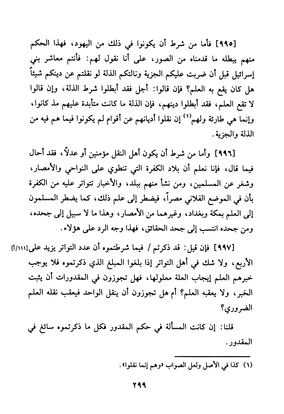 [995] فَأَما من شَرط أَن يَكُونُوا فِي ذَلِك من الْيَهُود، فَهَذَا الحكم مِنْهُم يُبطلهُ مَا قدمْنَاهُ من الصُّور، على أَن نقُول لَهُم: فَأنْتم معاشر بني إِسْرَائِيل قبل ان ضربت عَلَيْكُم الْجِزْيَة ونالتكم الذلة لَو نقلتم عَن دينكُمْ شَيْئا هَل كَانَ يَقع بِهِ الْعلم؟ فان قَالُوا: أجل فقد أبطلوا شَرط الذلة، وَإِن قَالُوا لَا تقع الْعلم، فقد أبطلوا دينهم، فَإِن الذلة مَا كَانَت متأبدة عَلَيْهِم مذ كَانُوا، وَإِنَّمَا هِيَ طارئة وَلَهُم إِن نقلوا أديانهم عَن اقوام لم يَكُونُوا فِيمَا هم فِيهِ من الذلة والجزية.