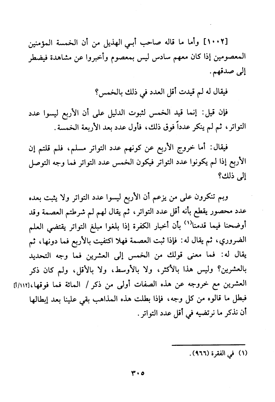 [1002] وَأما مَا قَالَه صَاحب أبي الْهُذيْل من أَن الْخَمْسَة الْمُؤمنِينَ المعصومين إِذا كَانَ مَعَهم سادس لَيْسَ بمعصوم وأخبروا عَن مُشَاهدَة فيضطر إِلَى صدقهم.