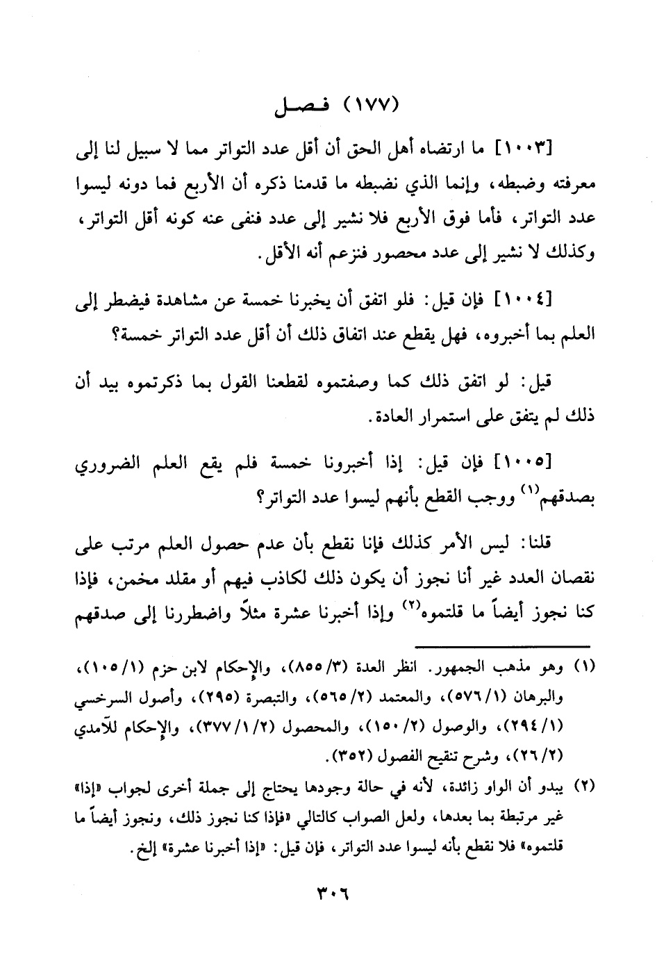 [1003] مَا ارْتَضَاهُ أهل الْحق أَن أقل عدد التَّوَاتُر مِمَّا لَا سَبِيل لنا إِلَى مَعْرفَته وَضَبطه، وَإِنَّمَا الَّذِي نضبطه مَا قدمنَا ذكره أَن الْأَرْبَع فَمَا دونه لَيْسُوا عدد التَّوَاتُر، فَأَما فَوق الْأَرْبَع فَلَا نشِير إِلَى عدد فنفى عَنهُ كَونه اقل التَّوَاتُر، وَكَذَلِكَ لَا نشِير إِلَى عدد مَحْصُور فنزعم أَنه الْأَقَل.