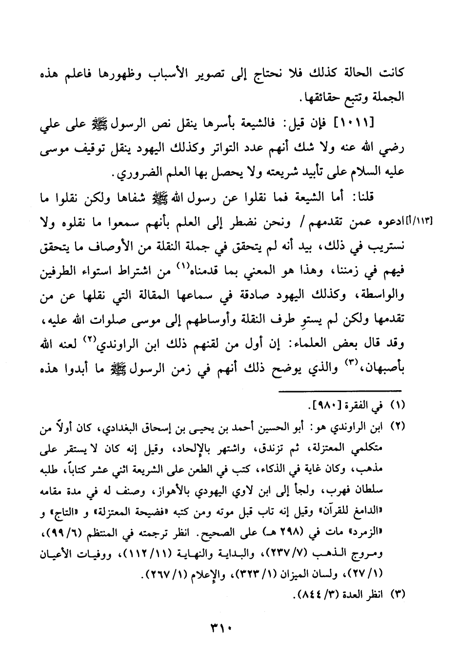 قُلْنَا: أما الشِّيعَة فَمَا نقلوا عَن رَسُول الله صلى الله عَلَيْهِ وَسلم شفاها وَلَكِن نقلوا مَا [113 / أ] ادعوهُ عَمَّن تقدمهم / وَنحن نضطر إِلَى الْعلم بانهم سمعُوا مَا نقلوه وَلَا نستريب فِي ذَلِك، بيد أَنه لم يتَحَقَّق فِي جملَة النقلَة من الْأَوْصَاف مَا يتَحَقَّق فيهم فِي زمننا، وَهَذَا هُوَ المعني بِمَا قدمْنَاهُ من اشْتِرَاط اسْتِوَاء الطَّرفَيْنِ والواسطة، وَكَذَلِكَ الْيَهُود صَادِقَة فِي سماعهَا الْمقَالة الَّتِي نقلهَا عَن من تقدمها وَلَكِن لم يستو طرف النقلَة وأوساطهم إِلَى مُوسَى صلوَات الله عَلَيْهِ، وَقد قَالَ بعض الْعلمَاء: ان أول من لقنهم ذَلِك ابْن الراوندي لَعنه الله بأصبهان، وَالَّذِي يُوضح ذَلِك أَنهم فِي زمن الرَّسُول صلى الله عَلَيْهِ وَسلم مَا أبدوا هَذِه