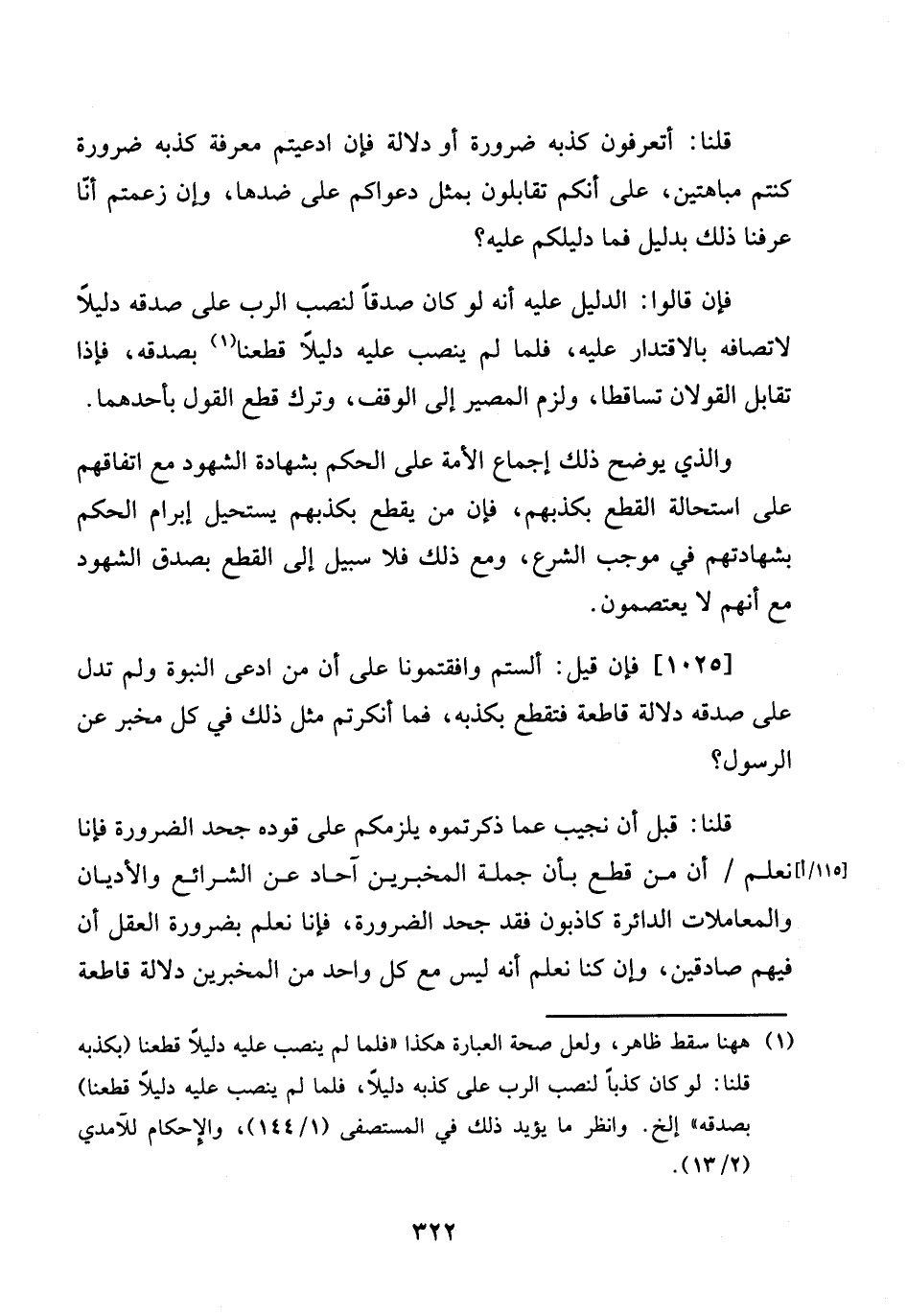 [1025] فَإِن قيل: ألستم وافقتمونا على أَن من ادّعى النُّبُوَّة وَلم تدل على صدقه دلَالَة قَاطِعَة فتقطع بكذبه، فَمَا أنكرتم مثل ذَلِك فِي كل مخبر عَن الرَّسُول؟