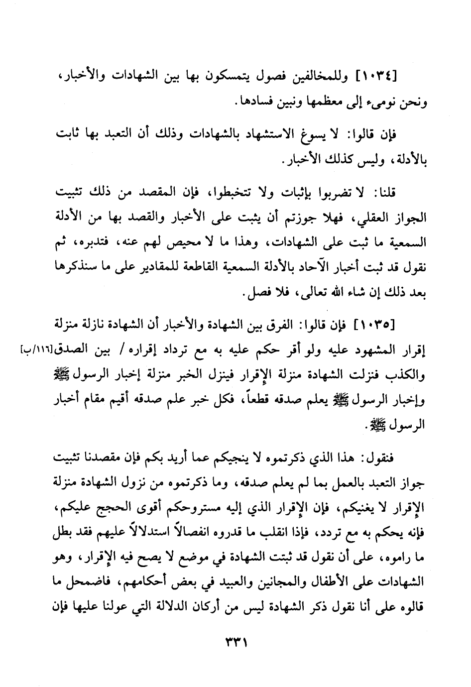 [1034] وللمخالفين فُصُول يتمسكون بهَا بَين الشَّهَادَات وَالْأَخْبَار، وَنحن نومىء إِلَى معظمها ونبين فَسَادهَا.