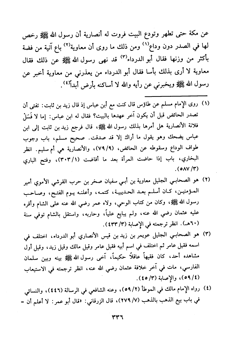 عَن مَكَّة حَتَّى تطهر وتودع الْبَيْت فروت لَهُ أنصارية أَن رَسُول الله صلى الله عَلَيْهِ وَسلم رخص لَهَا فِي الصَّدْر دون وداع وَمن ذَلِك مَا روى أَن مُعَاوِيَة بَاعَ آنِية من فضَّة بِأَكْثَرَ من وَزنهَا فَقَالَ أَبُو الدَّرْدَاء قد نهى رَسُول الله صلى الله عَلَيْهِ وَسلم عَن ذَلِك فَقَالَ مُعَاوِيَة لَا أرى بذلك بَأْسا فَقَالَ أَبُو الدَّرْدَاء من يعذرني من مُعَاوِيَة أخبر عَن رَسُول الله صلى الله عَلَيْهِ وَسلم ويخبرني عَن رَأْيه وَالله لَا أساكنه بِأَرْض أبدا.