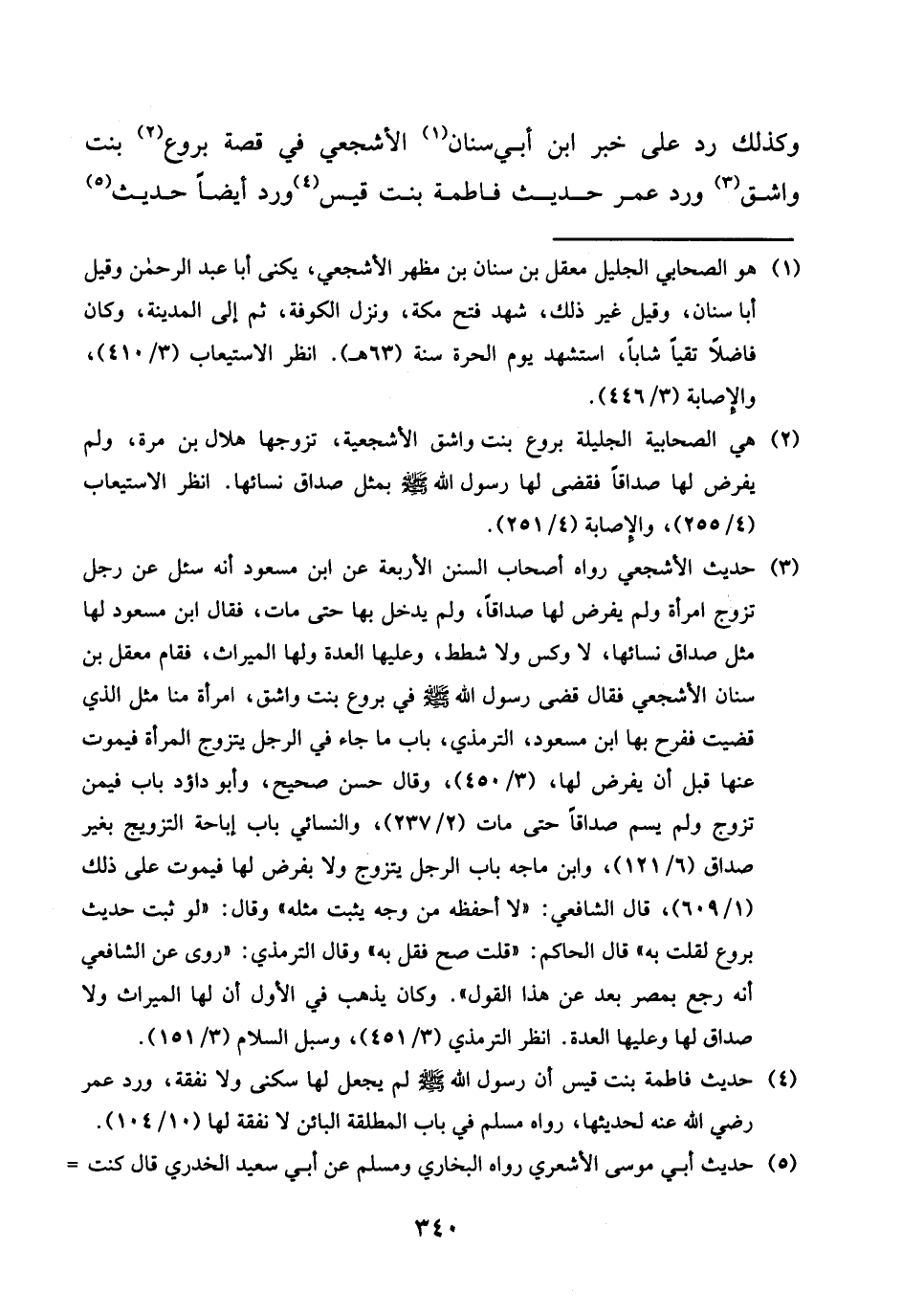 وَكَذَلِكَ رد على خبر ابْن أبي سِنَان الْأَشْجَعِيّ فِي قصَّة بروع بنت واشق ورد عمر حَدِيث فَاطِمَة بنت قيس ورد أَيْضا