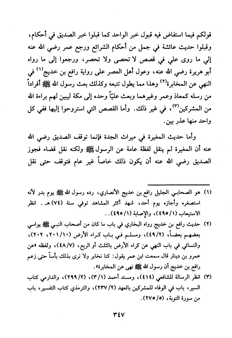 قَوْلكُم فِيمَا استفاض فِيهِ قبُول خبر الْوَاحِد كَمَا قبلوا خبر الصّديق فِي أَحْكَام، وقبلوا حَدِيث عَائِشَة فِي جمل من أَحْكَام الشَّرَائِع وَرجع عمر رَضِي الله عَنهُ إِلَى مَا روى عَليّ فِي قصَص لَا تحصى وَلَا تحصر، وَرَجَعُوا إِلَى مَا رَوَاهُ أَبُو هُرَيْرَة رَضِي الله عَنهُ، وعول أهل الْعَصْر على رِوَايَة رَافع بن خديج فِي النَّهْي عَن المخابرة وَهَذَا مِمَّا يطول تتبعه وَكَذَلِكَ بعث رَسُول الله صلى الله عَلَيْهِ وَسلم أفرادا من رسله كمعاذ وَعمر وَغَيرهمَا وَبعث عليا وَحده إِلَى مَكَّة ليبين لَهُم بَرَاءَة الله من الْمُشْركين، فِي غير ذَلِك. وَأما الْقَصَص الَّتِي استروحوا إِلَيْهَا فَفِي كل وَاحِد مِنْهَا عذر بَين.