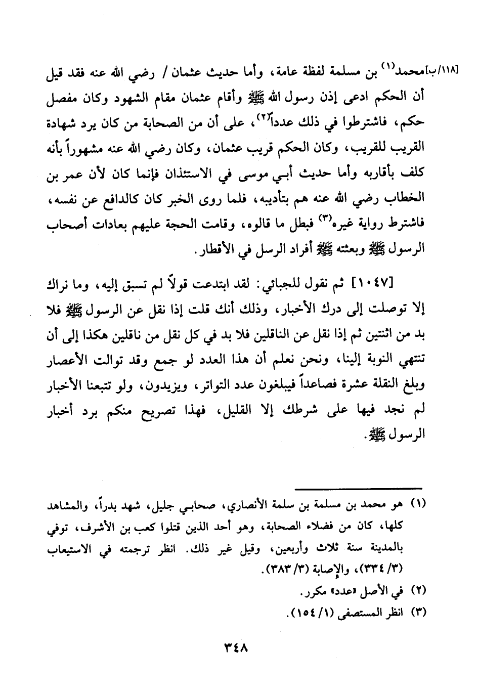 [118 - ب] مُحَمَّد بن مسلمة لَفْظَة عَامَّة، وَأما حَدِيث عُثْمَان / رَضِي الله عَنهُ فقد قيل أَن الحكم ادّعى إِذن رَسُول الله صلى الله عَلَيْهِ وَسلم وَأقَام عُثْمَان مقَام الشُّهُود وَكَانَ مفصل حكم، فَاشْتَرَطُوا فِي ذَلِك عددا، على أَن من الصَّحَابَة من كَانَ يرد شَهَادَة الْقَرِيب للقريب، وَكَانَ الحكم قريب عُثْمَان، وَكَانَ رَضِي الله عَنهُ مَشْهُورا بِأَنَّهُ كلف بأقاربه وَأما حَدِيث أبي مُوسَى فِي الاسْتِئْذَان فَإِنَّمَا كَانَ لِأَن عمر بن الْخطاب رَضِي الله عَنهُ هم بتأديبه، فَلَمَّا روى الْخَبَر كَانَ كالدافع عَن نَفسه، فَاشْترط رِوَايَة غَيره فَبَطل مَا قَالُوهُ، وَقَامَت الْحجَّة عَلَيْهِم بعادات أَصْحَاب الرَّسُول صلى الله عَلَيْهِ وَسلم وبعثته صلى الله عَلَيْهِ وَسلم أَفْرَاد الرُّسُل فِي الأقطار.
