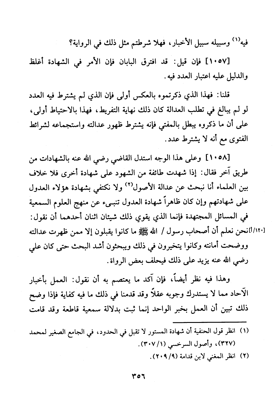 [1058] وعَلى هَذَا الْوَجْه اسْتدلَّ القَاضِي رَضِي الله عَنهُ بالشهادات من طَرِيق آخر فَقَالَ: إِذا شهِدت طَائِفَة من الشُّهُود على شَهَادَة أُخْرَى فَلَا خلاف بَين الْعلمَاء أَنا نبحث عَن عَدَالَة الْأُصُول وَلَا نكتفي بِشَهَادَة هَؤُلَاءِ الْعُدُول على شَهَادَتهم وَإِن كَانَ ظَاهرا شَهَادَة الْعُدُول تنبىء عَن مَنْهَج الْعُلُوم السمعية فِي الْمسَائِل المجتهدة فَإِنَّمَا الَّذِي يُقَوي ذَلِك شَيْئَانِ اثْنَان أَحدهمَا أَن نقُول: [120 / 1] نَحن نعلم أَن أَصْحَاب رَسُول الله صلى الله عَلَيْهِ وَسلم مَا كَانُوا يقبلُونَ إِلَّا مِمَّن ظَهرت عَدَالَته ووضحت أَمَانَته وَكَانُوا يتخيرون فِي ذَلِك ويبحثون أَشد الْبَحْث حَتَّى كَانَ عَليّ رَضِي الله عَنهُ يزِيد على ذَلِك فَيحلف بعض الروَاة.