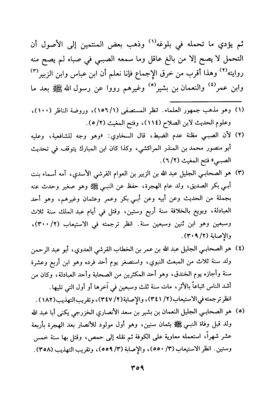 ثمَّ يُؤَدِّي مَا تحمله فِي بُلُوغه وَذهب بعض المنتمين إِلَى الْأُصُول أَن التَّحَمُّل لَا يَصح إِلَّا من بَالغ عَاقل وَمَا سَمعه الصَّبِي فِي صباه لم يَصح مِنْهُ رِوَايَته وَهَذَا أقرب من خرق الْإِجْمَاع فانا نعلم أَن ابْن عَبَّاس وَابْن الزبير وَابْن عمر والنعمان بن بشير وَغَيرهم رووا عَن رَسُول الله صلى الله عَلَيْهِ وَسلم بعد مَا