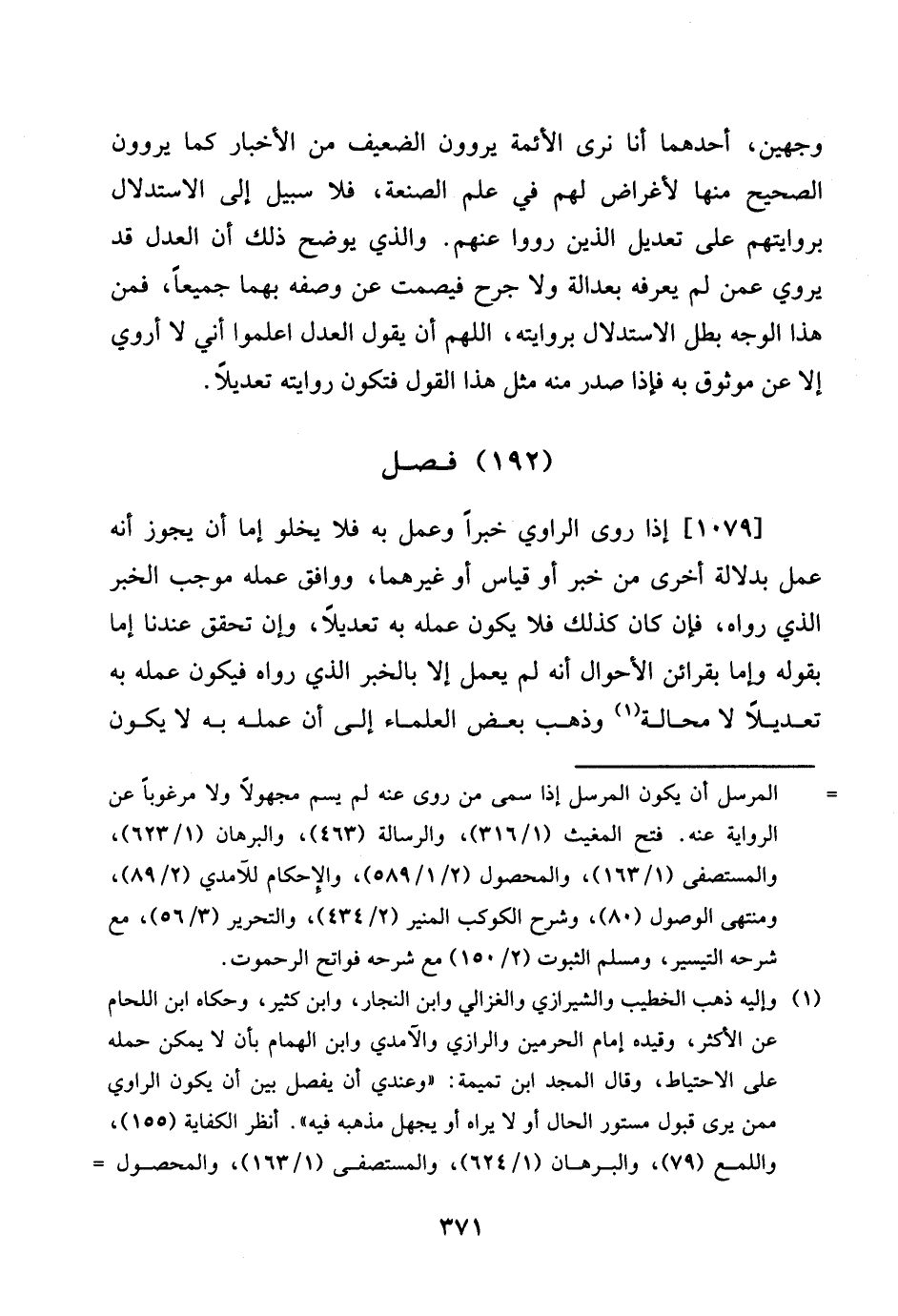 [1079] إِذا روى الرَّاوِي خَبرا وَعمل بِهِ فَلَا يَخْلُو إِمَّا أَن يجوز أَنه عمل بِدلَالَة أُخْرَى من خبر أَو قِيَاس أَو غَيرهمَا، وَوَافَقَ عمله مُوجب الْخَبَر الَّذِي رَوَاهُ، فَإِن كَانَ كَذَلِك فَلَا يكون عمله بِهِ تعديلا، وَإِن تحقق عندنَا أما بقوله وَإِمَّا بقرائن الْأَحْوَال أَنه لم يعْمل إِلَّا بالْخبر الَّذِي رَوَاهُ فَيكون عمله بِهِ تعديلا لَا محَالة وَذهب بعض الْعلمَاء إِلَى ان عمله بِهِ لَا يكون