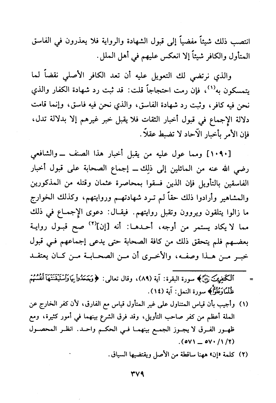 [1090] وَمِمَّا عول عَلَيْهِ من يقبل أَخْبَار هَذَا الصِّنْف - وَالشَّافِعِيّ رَضِي الله عَنهُ من المائلين إِلَى ذَلِك - إِجْمَاع الصَّحَابَة على قبُول أَخْبَار الْفَاسِقين بالتأويل فَإِن الَّذين فسقوا بمحاصرة عُثْمَان وَقَتله من الْمَذْكُورين والمشاهير وارادوا ذَلِك حَقًا لم ترد شَهَادَتهم وروايتهم، وَكَذَلِكَ الْخَوَارِج مَا زَالُوا يتلقون ويروون وَتقبل روايتهم. فَيُقَال: دَعْوَى الْإِجْمَاع فِي ذَلِك مِمَّا لَا يكَاد يسْتَمر من أوجه، أَحدهَا: أَنه [إِن] صَحَّ قبُول رِوَايَة بَعضهم فَلم يتَحَقَّق ذَلِك من كَافَّة الصَّحَابَة حَتَّى يدعى إِجْمَاعهم فِي قبُول خبر من هَذَا وَصفه، وَالْأُخْرَى أَن من الصَّحَابَة من كَانَ يعْتَقد
