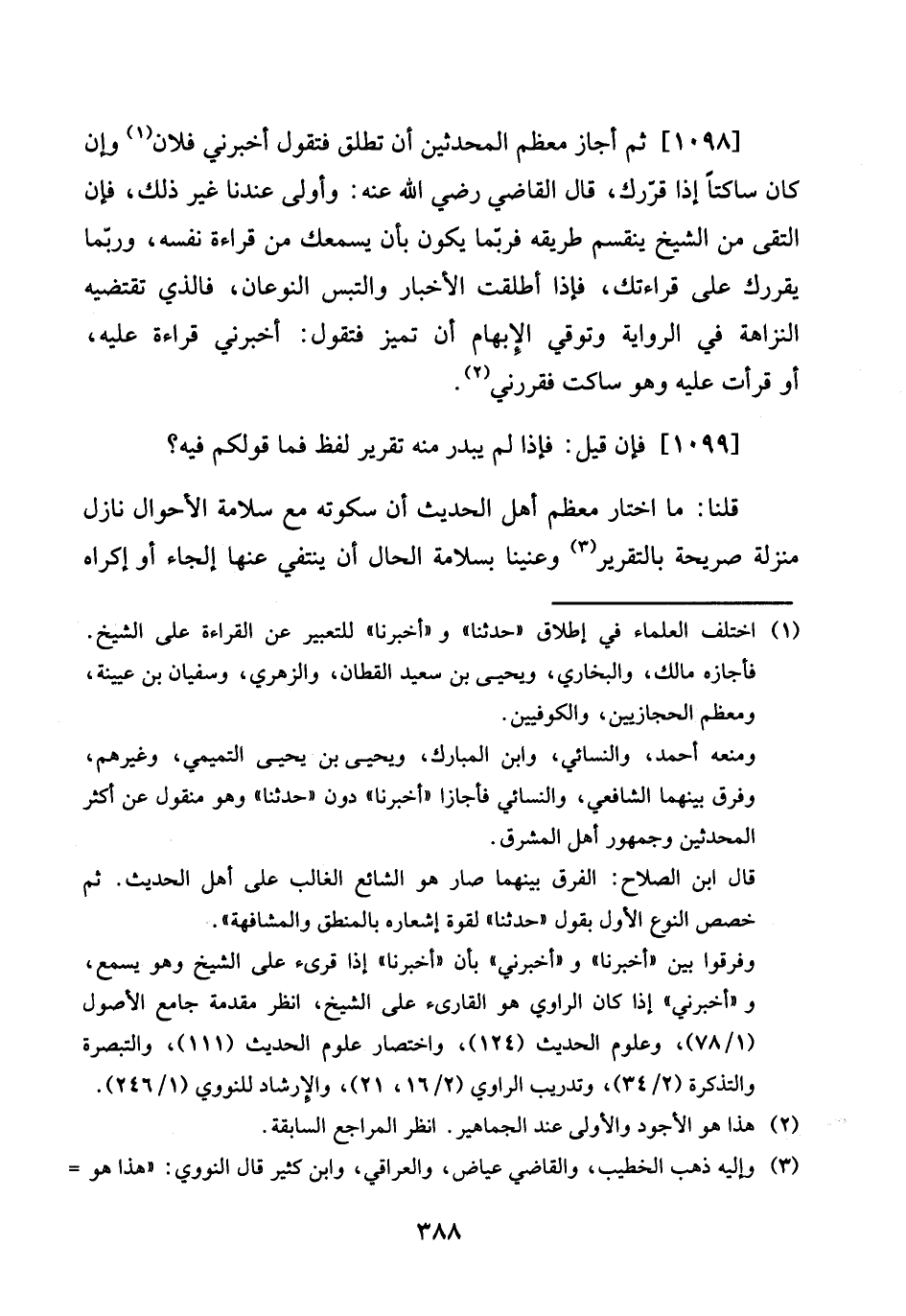 [1098 ي ثمَّ أجَاز مُعظم الْمُحدثين أَن تطلق فَتَقول أَخْبرنِي فلَان وَإِن كَانَ ساكتا إِذا قررك، قَالَ القَاضِي رَضِي الله عَنهُ: وَأولى عندنَا غير ذَلِك، فَإِن التقى من الشَّيْخ يَنْقَسِم طَرِيقه فَرُبمَا يكون بِأَن يسمعك من قِرَاءَة نَفسه، وَرُبمَا يقررك على قراءتك، فَإِذا أطلقت الْأَخْبَار والتبس النوعان، فَالَّذِي تَقْتَضِيه النزاهة فِي الرِّوَايَة وتوقي الْإِبْهَام أَن تميز فَتَقول: أَخْبرنِي قِرَاءَة عَلَيْهِ، أَو قَرَأت عَلَيْهِ وَهُوَ سَاكِت فقررني.