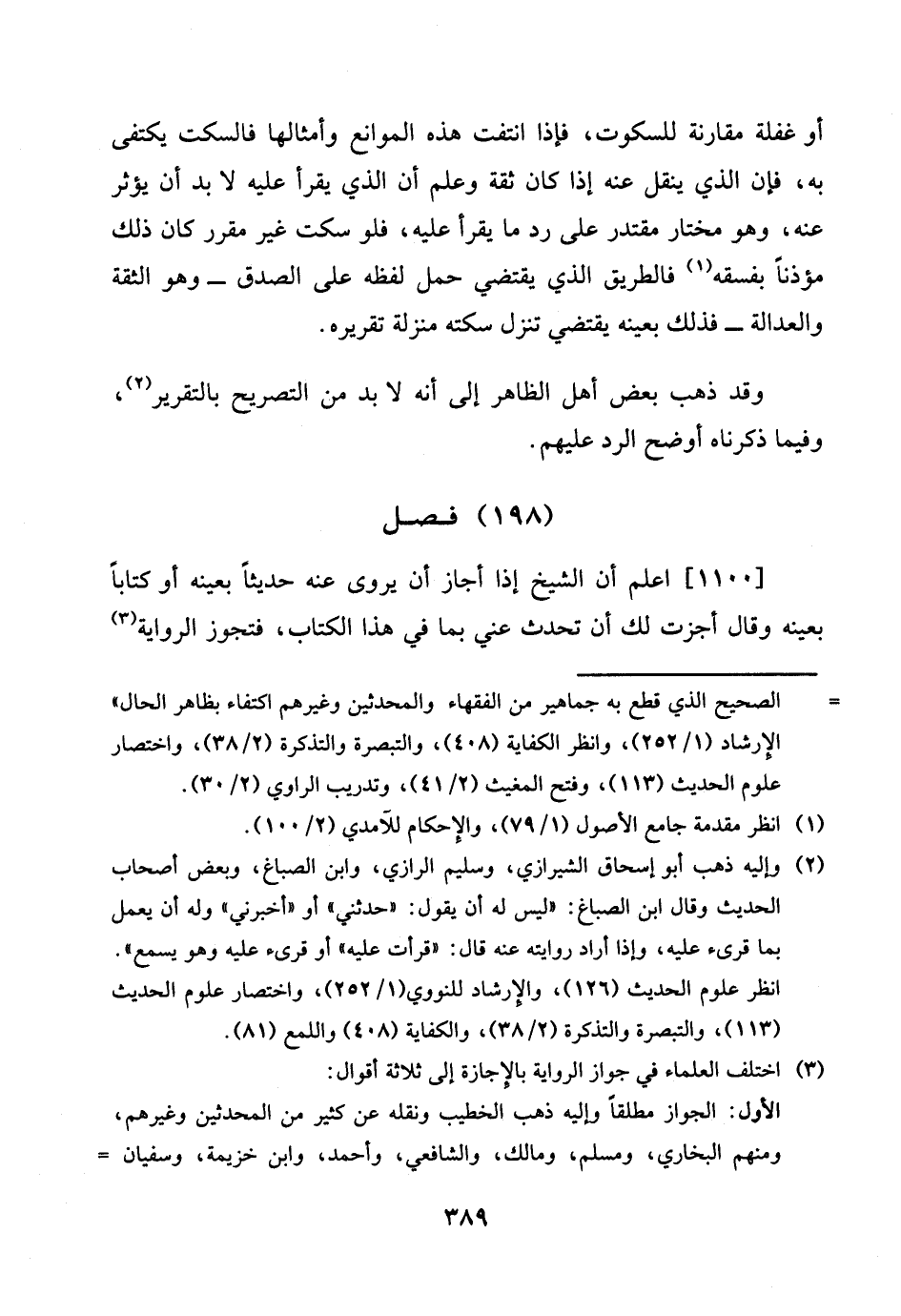 [1100] اعْلَم أَن الشَّيْخ إِذا أجَاز أَن يرْوى عَنهُ حَدِيثا بِعَيْنِه أَو كتابا بِعَيْنِه وَقَالَ أجزت لَك أَن تحدث عني بِمَا فِي هَذَا الْكتاب، فَتجوز الرِّوَايَة