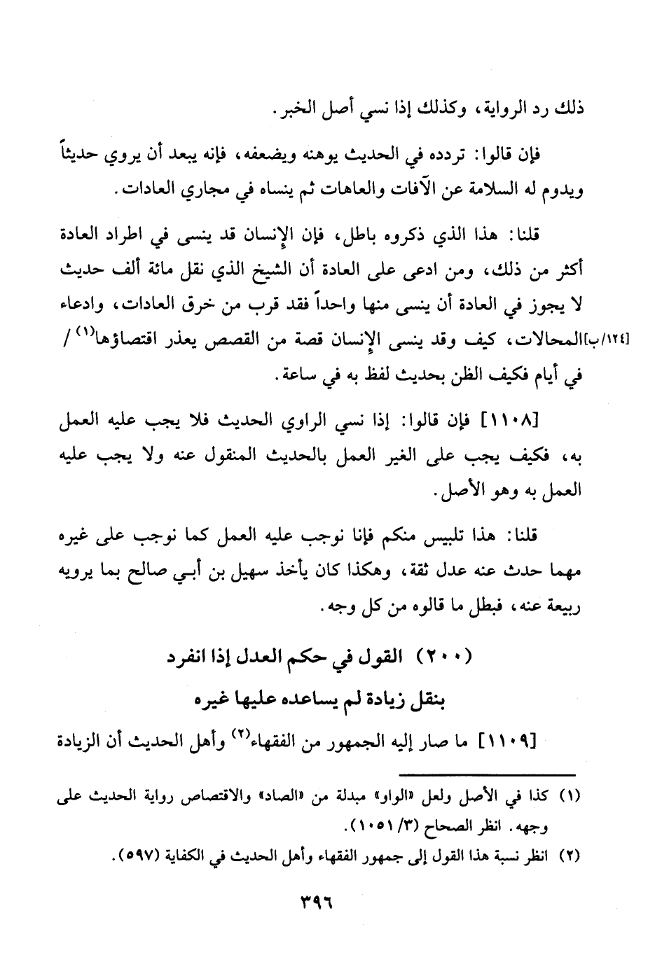 قُلْنَا: هَذَا الَّذِي ذَكرُوهُ بَاطِل، فَإِن الْإِنْسَان قد ينسى فِي اطراد الْعَادة أَكثر من ذَلِك، وَمن ادّعى على الْعَادة أَن الشَّيْخ الَّذِي نقل مائَة ألف حَدِيث لَا يجوز فِي الْعَادة أَن ينسى مِنْهَا وَاحِدًا فقد قرب من خرق الْعَادَات، وادعاء [124 / ب] المحالات، كَيفَ وَقد ينسى الْإِنْسَان قصَّة من الْقَصَص يعْذر اقتصاؤهاايام فِي فَكيف الظَّن بِحَدِيث لفظ بِهِ فِي سَاعَة.