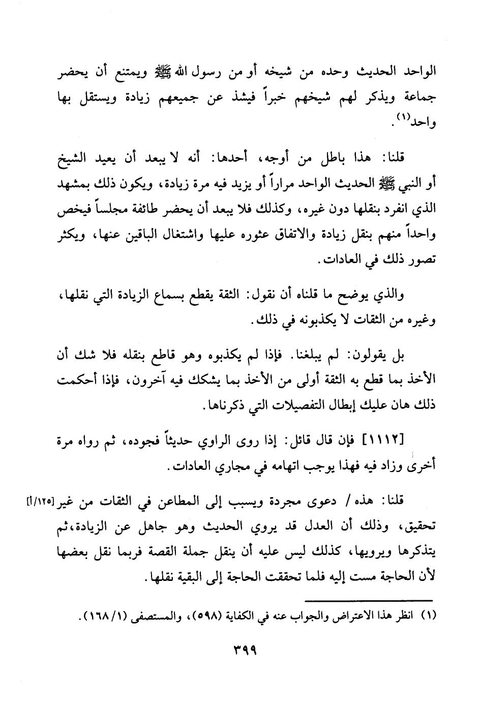 [1112] فَإِن قَالَ قَائِل: إِذا روى الرَّاوِي حَدِيثا فجوده، ثمَّ رَوَاهُ مرّة أُخْرَى وَزَاد فِيهِ فَهَذَا يُوجب اتهامه فِي مجاري االعادات.