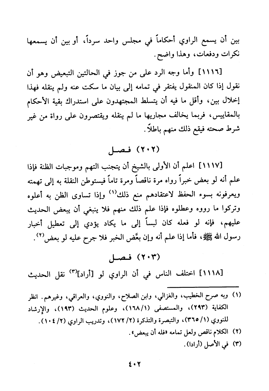[1117] اعْلَم أَن الأولى بالشيخ أَن يتَجَنَّب التهم وموجبات الظنة فَإِذا علم أَنه لَو بعض خَبرا رَوَاهُ مرّة نَاقِصا وَمرَّة تَاما فيستوطن النقلَة بِهِ إِلَى تهمته ويعرفونه بِسوء الْحِفْظ لاعتقادهم منع ذَلِك وَإِذا تساوى الظَّن بِهِ أعلوه وَتركُوا مَا رَوَوْهُ وعطلوه فَإِذا علم ذَلِك مِنْهُم فَلَا يَنْبَغِي أَن يبعض الحَدِيث عَلَيْهِم، فَإِنَّهُ لَو فعله كَانَ لبسا إِلَى مَا يكَاد يُؤَدِّي إِلَى تَعْطِيل أَخْبَار رَسُول الله صلى الله عَلَيْهِ وَسلم، فَأَما إِذا علم أَنه وَإِن بعض الْخَبَر فَلَا جرح عَلَيْهِ لَو بعض.