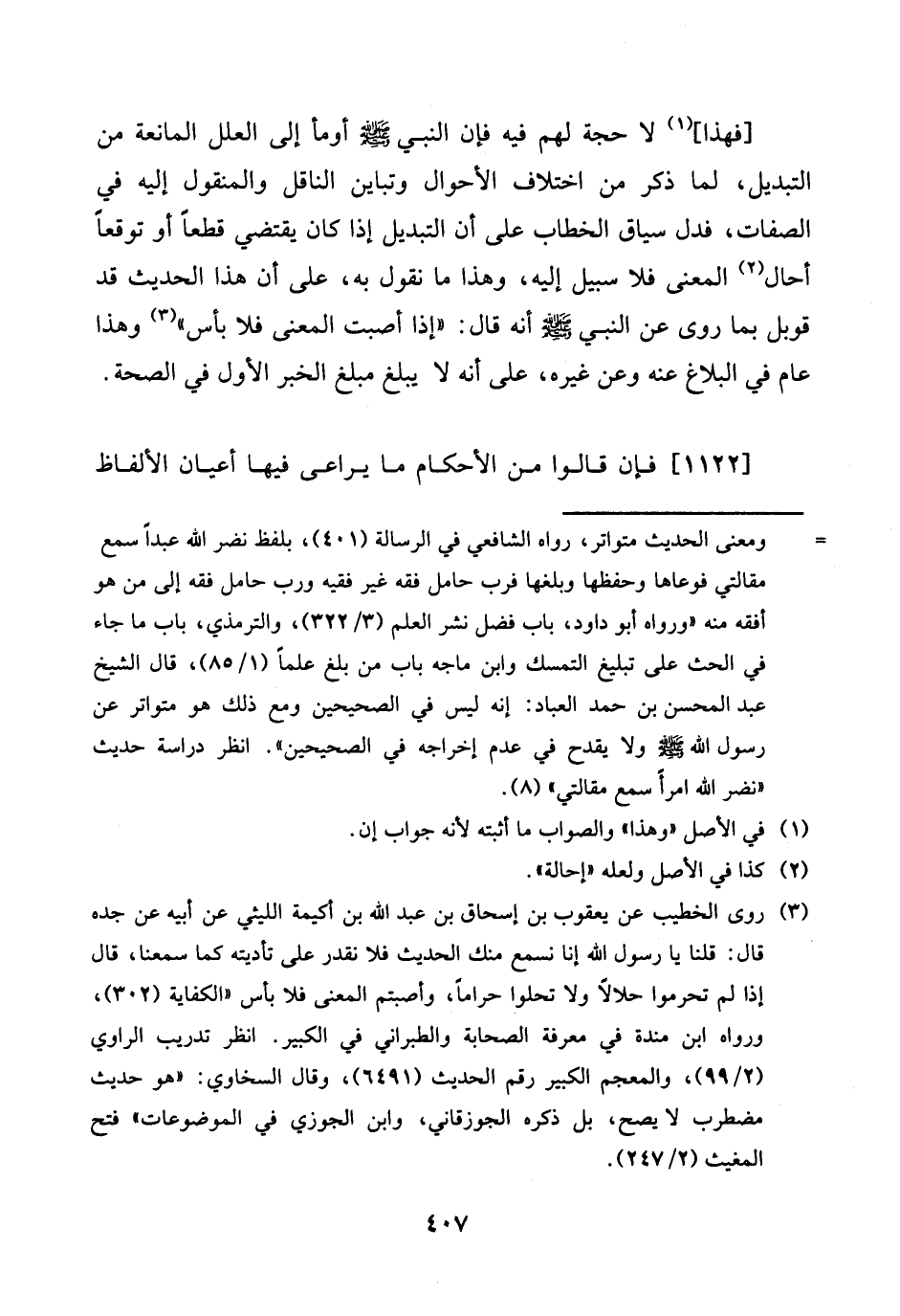 [فَهَذَا] لَا حجَّة لَهُم فِيهِ فَإِن النَّبِي صلى الله عَلَيْهِ وَسلم أَوْمَأ إِلَى الْعِلَل الْمَانِعَة من التبديل، لما ذكر من اخْتِلَاف الْأَحْوَال وتباين النَّاقِل وَالْمَنْقُول إِلَيْهِ فِي الصِّفَات، فَدلَّ سِيَاق الْخطاب على ان التبديل إِذا كَانَ يَقْتَضِي قطعا أَو توقعا أحَال الْمَعْنى فَلَا سَبِيل إِلَيْهِ، وَهَذَا مَا نقُول بِهِ، على أَن هَذَا الحَدِيث قد قوبل بِمَا روى عَن النَّبِي صلى الله عَلَيْهِ وَسلم أَنه قَالَ: " إِذا أصبت الْمَعْنى فَلَا بَأْس " وَهَذَا عَام فِي الْبَلَاغ عَنهُ وَعَن غَيره، على أَنه لَا يبلغ مبلغ الْخَبَر الأول فِي الصِّحَّة.