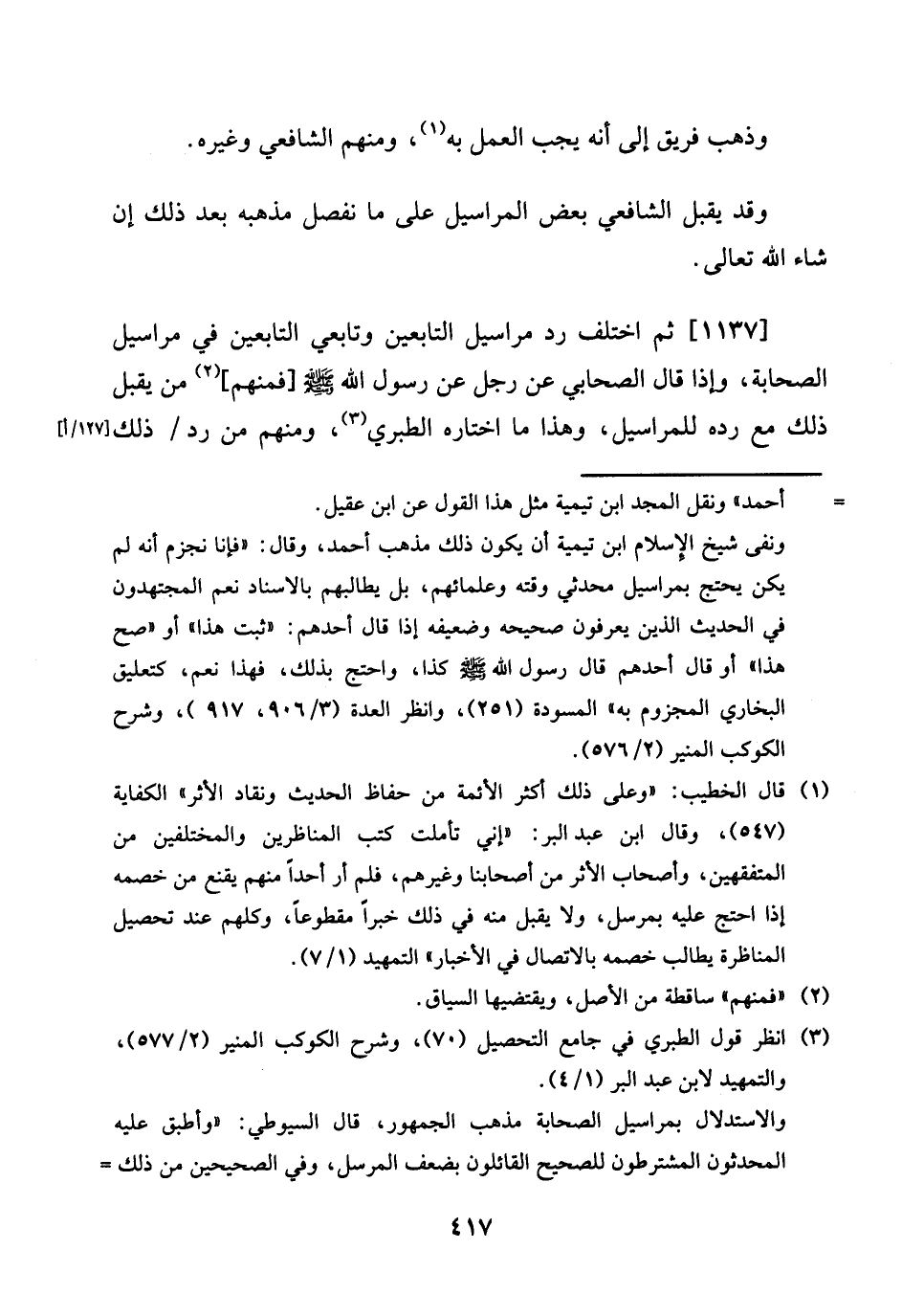 [1137] ثمَّ اخْتلف رد مَرَاسِيل التَّابِعين وتابعي التَّابِعين فِي مَرَاسِيل الصَّحَابَة، وَإِذا قَالَ الصَّحَابِيّ عَن رجل عَن رَسُول الله صلى الله عَلَيْهِ وَسلم [فَمنهمْ] من يقبل ذَلِك مَعَ رده للمراسيل، وَهَذَا مَا اخْتَارَهُ الطَّبَرِيّ، وَمِنْهُم من رد / ذَلِك [127 / أ]