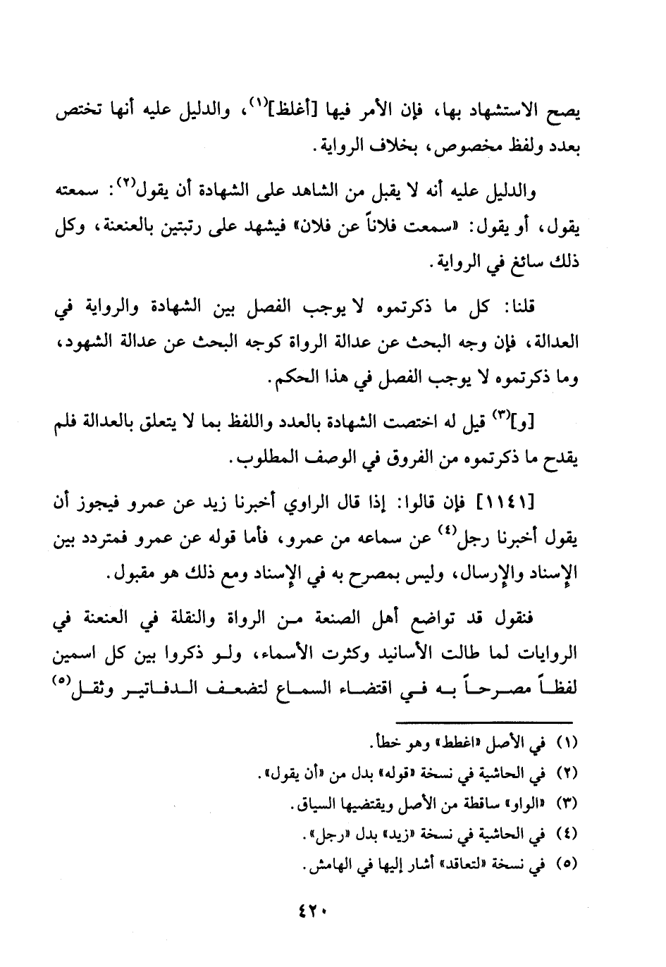 وَالدَّلِيل عَلَيْهِ أَنه لَا يبل من الشَّاهِد على الشَّهَادَة أَن يَقُول: سمعته يَقُول، أَو يَقُول: " سَمِعت فلَانا عَن فلَان " فَيشْهد على رتبتين بالعنعنة، وكل ذَلِك سَائِغ فِي الرِّوَايَة.