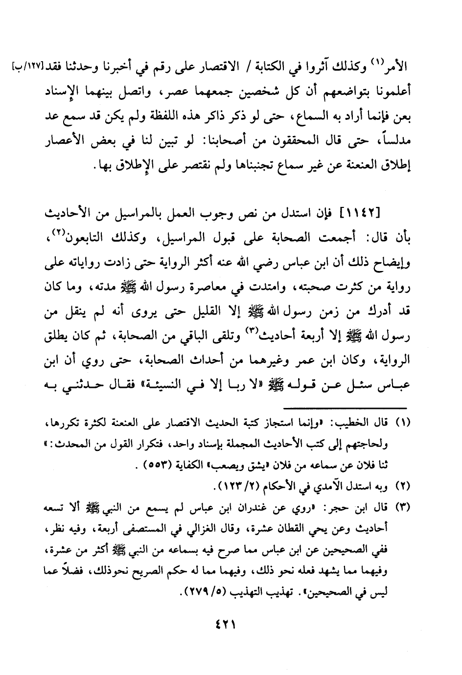 [1142] فَإِن اسْتدلَّ من نَص وجوب الْعَمَل بالمراسيل من الْأَحَادِيث بِأَن قَالَ: أَجمعت الصَّحَابَة على قبُول الْمَرَاسِيل، وَكَذَلِكَ التابعون. وإيضاح ذَلِك أَن ابْن عَبَّاس رَضِي الله عَنهُ أَكثر الرِّوَايَة حَتَّى زَادَت رواياته على رِوَايَة من كثرت صحبته، وامتدت فِي معاصرة رَسُول الله صلى الله عَلَيْهِ وَسلم مدَّته، وَمَا كَانَ قد أدْرك من زمن رَسُول الله صلى الله عَلَيْهِ وَسلم إِلَّا الْقَلِيل حَتَّى يرْوى أَنه لم ينْقل من رَسُول الله صلى الله عَلَيْهِ وَسلم إِلَّا أَرْبَعَة أَحَادِيث وتلقى الْبَاقِي من الصَّحَابَة، ثمَّ كَانَ يُطلق الرِّوَايَة، وَكَانَ ابْن عمر وَغَيرهمَا من أَحْدَاث الصَّحَابَة، حَتَّى رُوِيَ أَن ابْن عَبَّاس سُئِلَ عَن قَوْله صلى الله عَلَيْهِ وَسلم " لَا رَبًّا إِلَّا فِي النَّسِيئَة " فَقَالَ حَدثنِي بِهِ