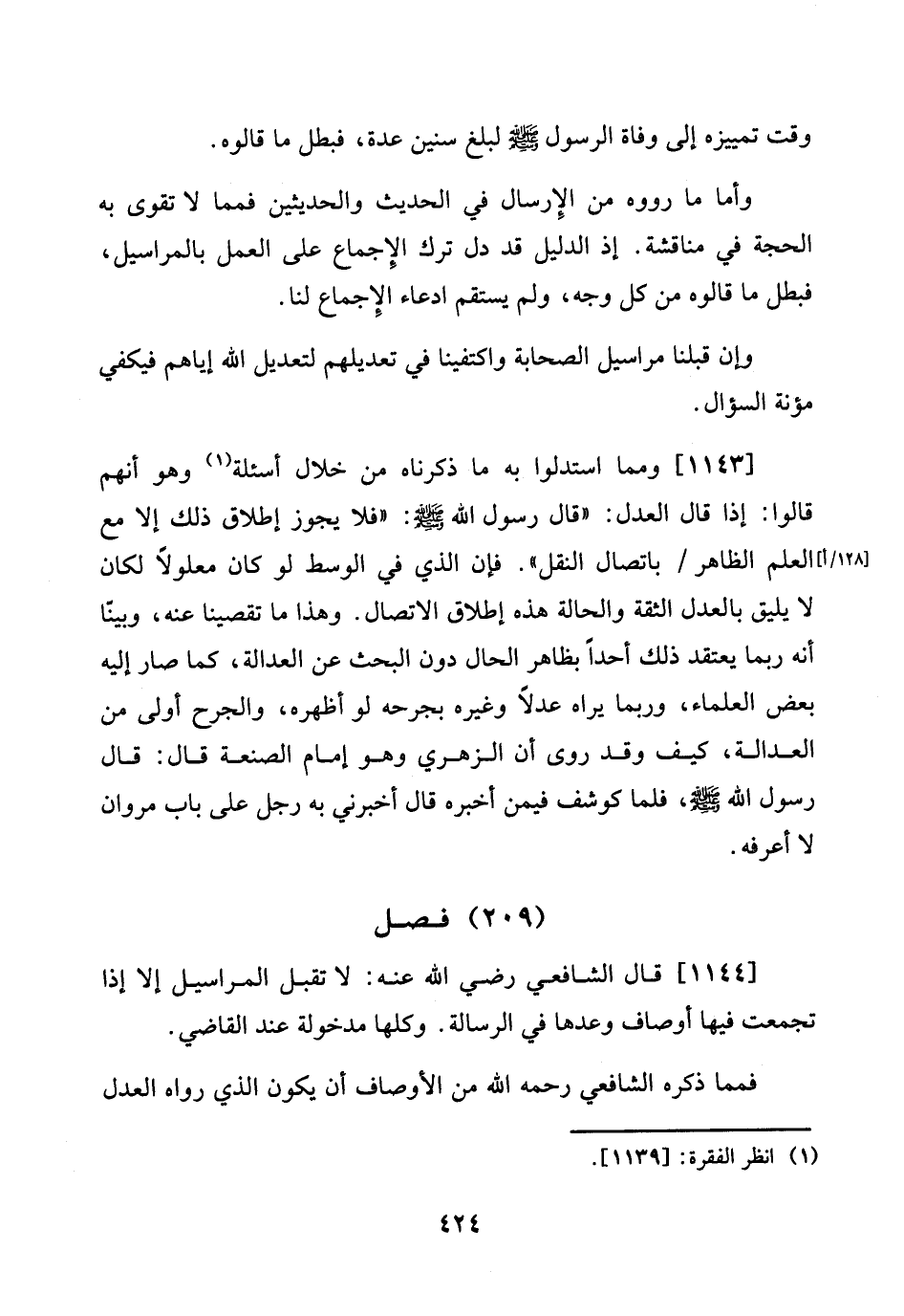 [1144] قَالَ الشَّافِعِي رَضِي الله عَنهُ: لَا تقبل الْمَرَاسِيل إِلَّا إِذا تجمعت فِيهَا أَوْصَاف وعدها فِي الرسَالَة. وَكلهَا مدخولة عِنْد القَاضِي.