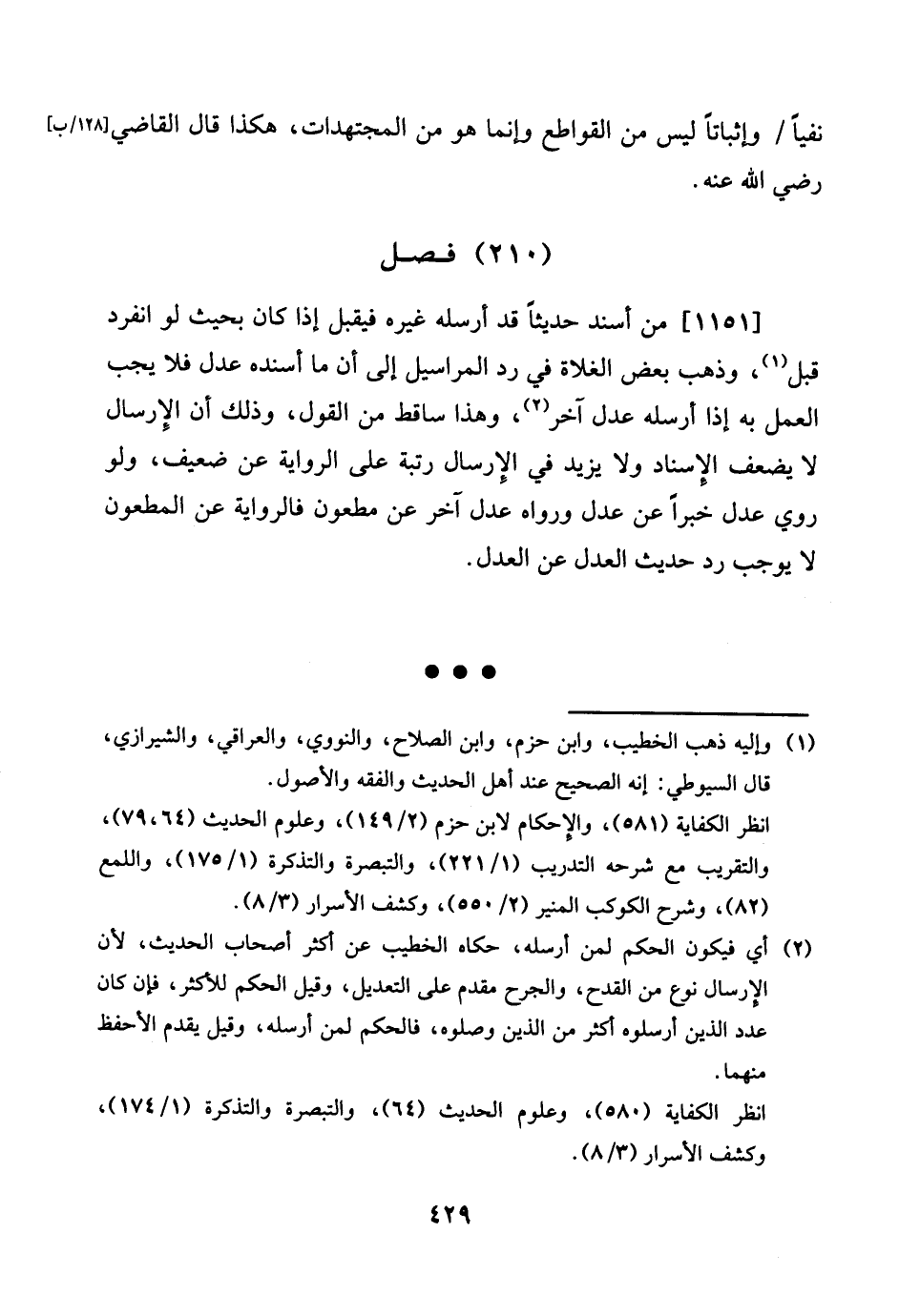 [1151] من أسْند حَدِيثا قد أرْسلهُ غَيره فَيقبل إِذا كَانَ بِحَيْثُ لَو انْفَرد قبل، وَذهب بعض الغلاة فِي رد الْمَرَاسِيل إِلَى أَن مَا أسْندهُ عدل فَلَا يجب الْعَمَل بِهِ إِذا ارسله عدل آخر، وَهَذَا سَاقِط من القَوْل، وَذَلِكَ أَن الْإِرْسَال لَا يضعف الْإِسْنَاد وَلَا يزِيد فِي الْإِرْسَال رُتْبَة على الرِّوَايَة عَن ضَعِيف، وَلَو رُوِيَ عدل خَبرا عَن عدل وَرَوَاهُ عدل آخر عَن مطعون فَالرِّوَايَة عَن المطعون لَا يُوجب رد حَدِيث الْعدْل عَن الْعدْل.